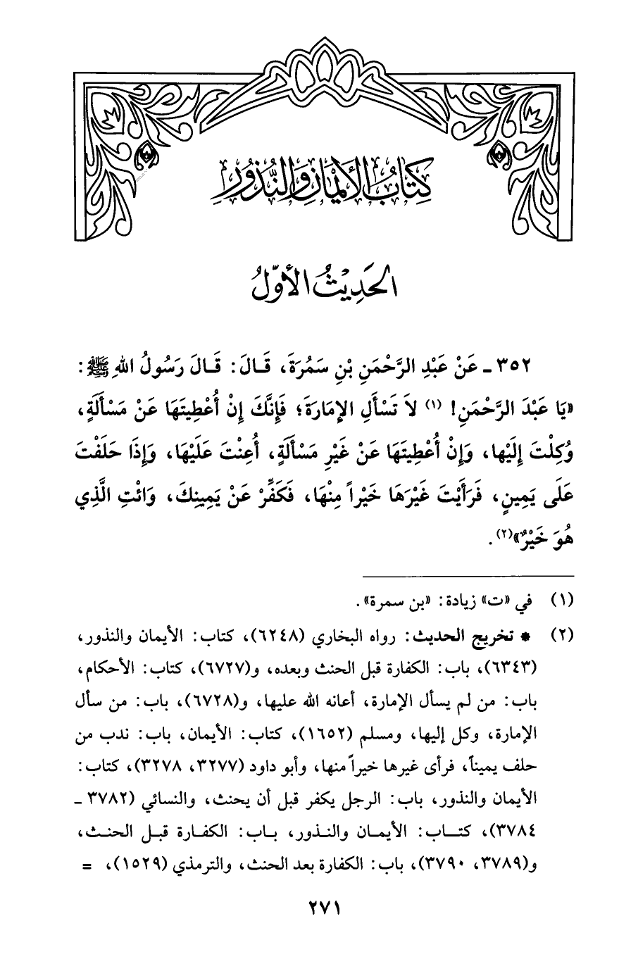 رواه البخاري (6248)، كتاب: الأيمان والنذور، (6343)، باب: الكفارة قبل الحنث وبعده، و (6727)، كتاب: الأحكام، باب: من لم يسأل الإمارة، أعانه اللَّه عليها، و (6728)، باب: من سأل الإمارة، وكل إليها، ومسلم (1652)، كتاب: الأيمان، باب: ندب من حلف يمينًا، فرأى غيرها خيرًا منها، وأبو داود (3277، 3278)، كتاب: الأيمان والنذور، باب: الرجل يكفر قبل أن يحنث، والنسائي (3782 - 3784)، كتاب: الأيمان والنذور، باب: الكفارة قبل الحنث، و (3789، 3790)، باب: الكفارة بعد الحنث، والترمذي (1529)، =