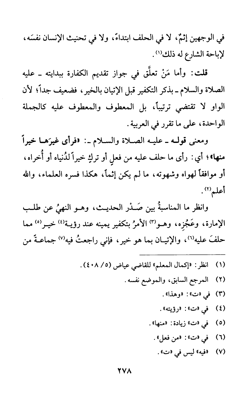 قلت: وأما مَنْ تعلَّق في جواز تقديم الكفارة ببدايته -عليه الصلاة والسلام- بذكر التكفير قبل الإتيان بالخير، فضعيف جدًا؛ لأن الواو لا تقتضي ترتيبًا، بل المعطوف والمعطوف عليه كالجملة الواحدة، على ما تقرر في العربية.