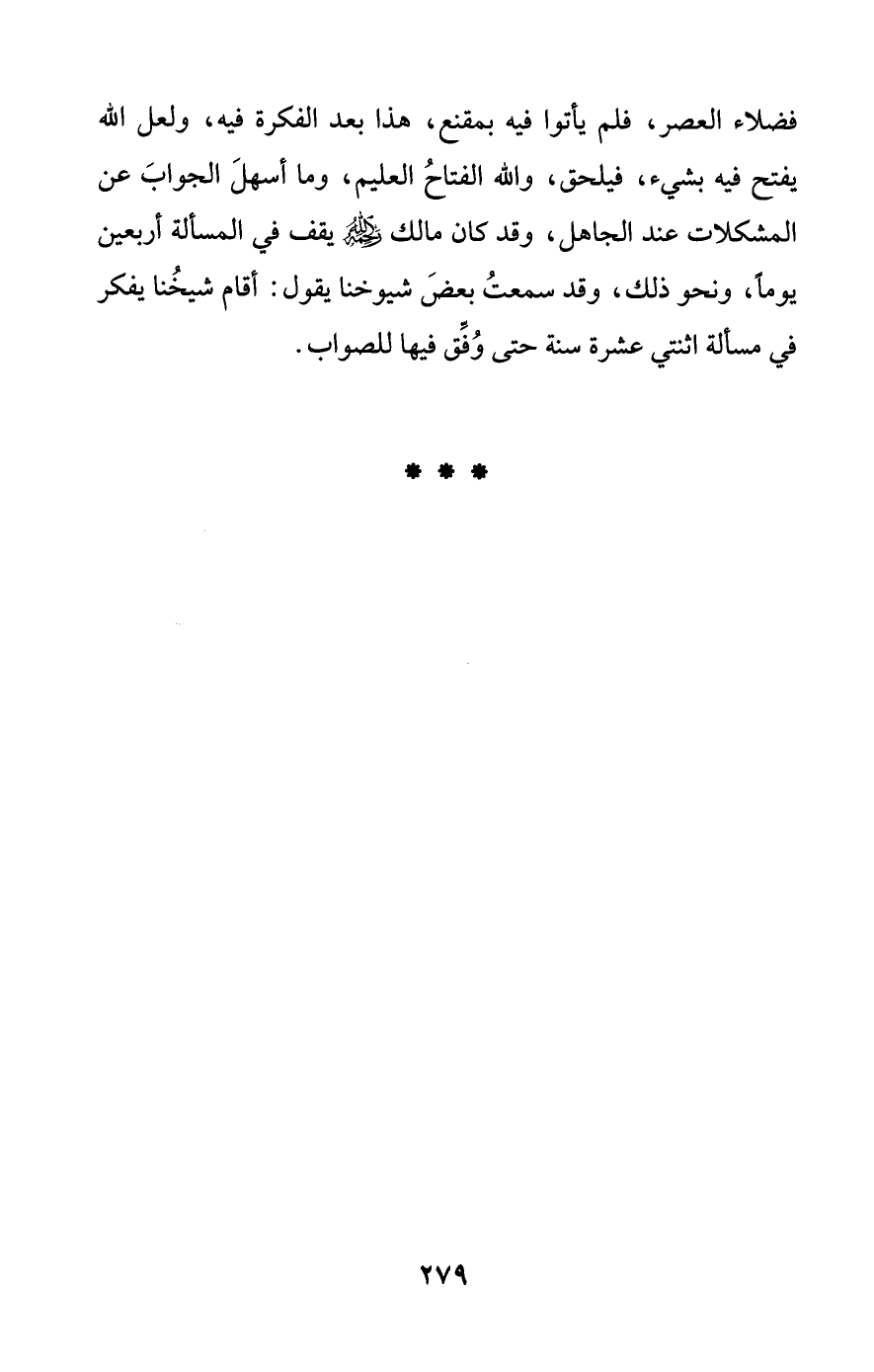 فضلاء العصر، فلم يأتوا فيه بمقنع، هذا بعد الفكرة فيه، ولعل اللَّه يفتح فيه بشيء، فيلحق، واللَّه الفتاحُ العليم، وما أسهلَ الجوابَ عن المشكلات عند الجاهل، وقد كان مالك رحمه اللَّه يقف في المسألةُ أربعين يومًا، ونحو ذلك، وقد سمعتُ بعضَ شيوخنا يقول: أقام شيخُنا يفكر في مسألة اثنتي عشرة سنة حتى وُفِّق فيها للصواب.