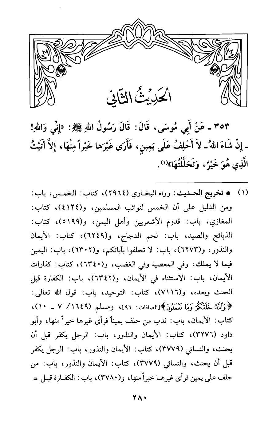 353 - عَنْ أَبي مُوسَى، قَالَ: قَالَ رَسُولُ اللَّهِ -صلى اللَّه عليه وسلم-: "إِنِّي وَاللَّهِ! -إِنْ شَاءَ اللَّهُ- لَا أَحْلِفُ عَلَى يَمِينٍ، فَأَرَى غَيْرَها خَيْرًا مِنْهَا، إِلَّا أتَيْتُ الَّذِي هُوَ خَيْرٌ، وَتَحَلَّلْتُهَا" (¬1).