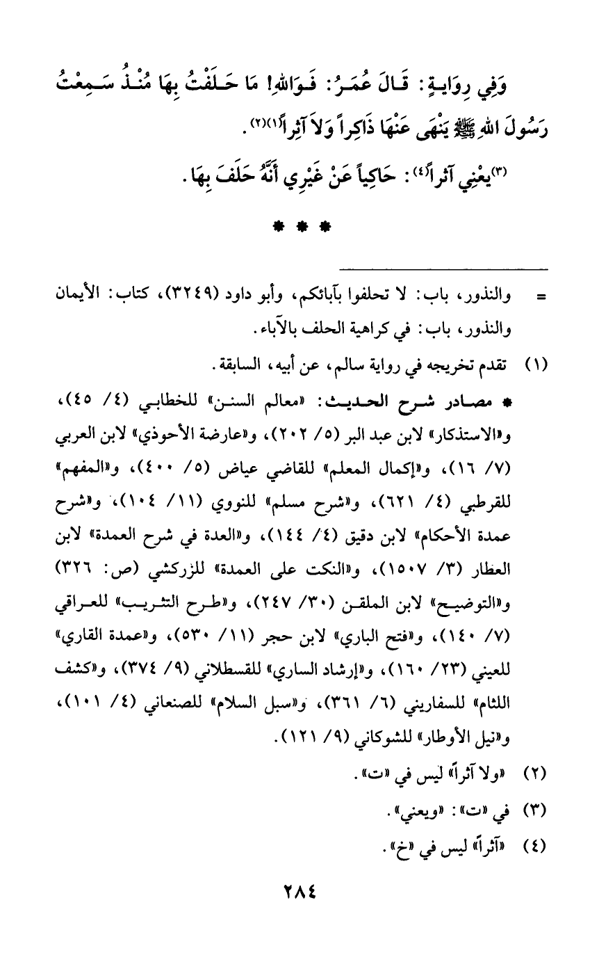وَفِي رِوَايةٍ: قَالَ عُمَرُ: فَوَاللَّهِ! مَا حَلَفْتُ بِهَا مُنْذُ سَمِعْتُ رَسُولَ اللَّهِ -صلى اللَّه عليه وسلم- يَنْهَى عَنْهَا ذَاكِرًا وَلَا آثِرًا (¬1) (¬2).