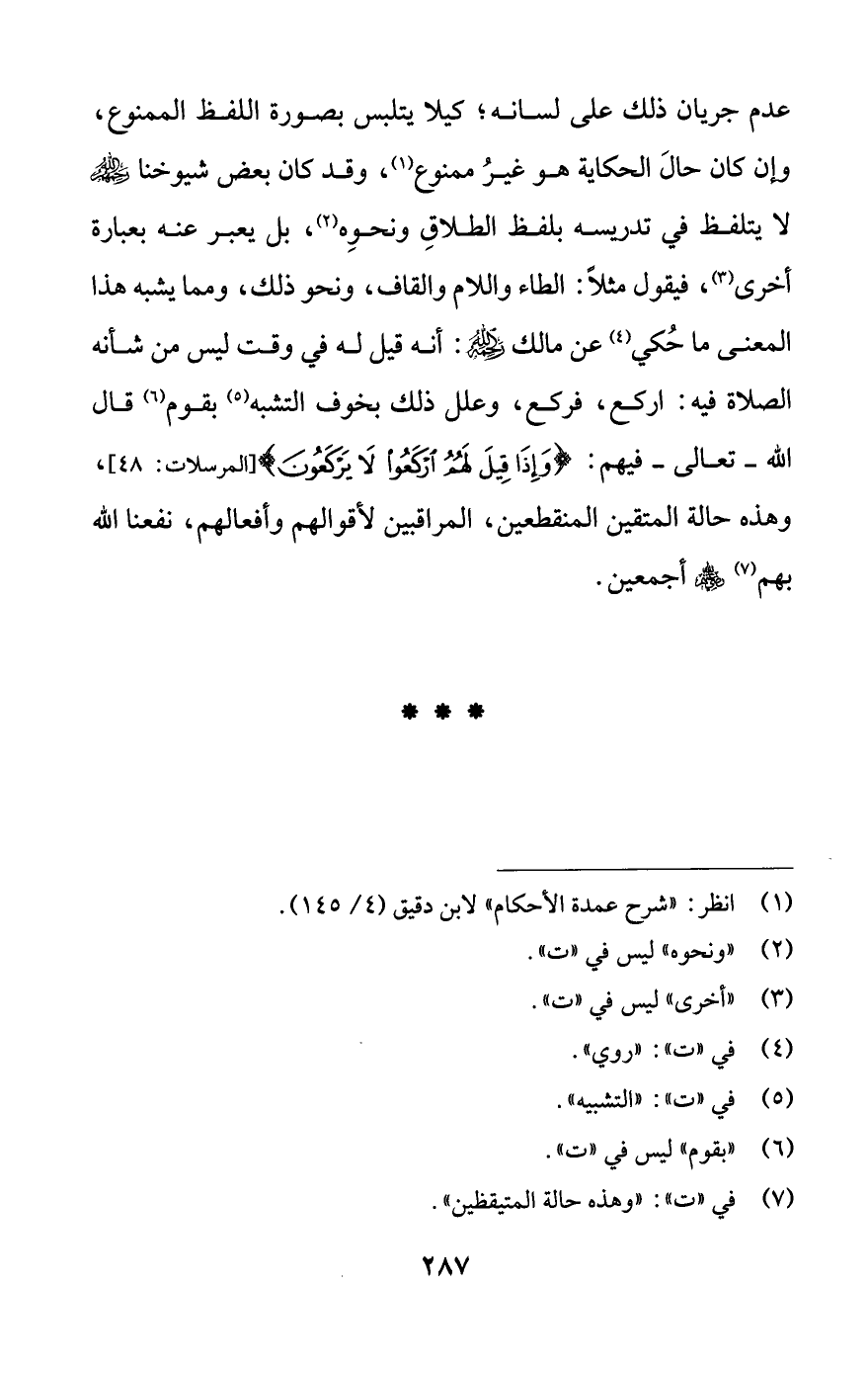 عدم جريان ذلك على لسانه؛ كيلا يتلبس بصورة اللفظ الممنوع، وإن كان حالَ الحكاية هو غيرُ ممنوع (¬1)، وقد كان بعض شيوخنا رَحِمَهُمُ اللَّهُ لا يتلفظ في تدريسه بلفظ الطلاقِ ونحوِه (¬2)، بل يعبر عنه بعبارة أخرى (¬3)، فيقول مثلًا: الطاء واللام والقاف، ونحو ذلك، ومما يشبه هذا المعنى ما حُكي (¬4) عن مالك رحمه اللَّه: أنه قيل له في وقت ليس من شأنه الصلاة فيه: اركع، فركع، وعلل ذلك بخوف التشبه (¬5) بقوم (¬6) قال اللَّه -تعالى- فيهم: {وَإِذَا قِيلَ لَهُمُ ارْكَعُوا لَا يَرْكَعُونَ} [المرسلات: 48]، وهذه حالة المتقين المنقطعين، المراقبين لأقوالهم وأفعالهم، نفعنا اللَّه بهم (¬7) -رضي اللَّه عنهم- أجمعين.
