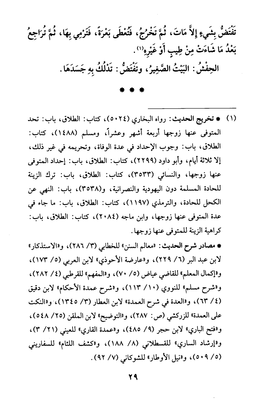 رواه البخاري (5024)، كتاب: الطلاق، باب: تحد المتوفى عنها زوجها أربعة أشهر وعشرًا، ومسلم (1488)، كتاب: الطلاق، باب: وجوب الإحداد في عدة الوفاة، وتحريمه في غير ذلك، إلا ثلاثة أيام، وأبو داود (2299)، كتاب: الطلاق، باب: إحداد المتوفي عنها زوجها، والنسائي (3533)، كتاب: الطلاق، باب: ترك الزينة للحادة المسلمة دون اليهودية والنصرانية، و (3538)، باب: النهي عن الكحل للحادة، والترمذي (1197)، كتاب: الطلاق، باب: ما جاء في عدة المتوفى عنها زوجها، وابن ماجه (2084)، كتاب: الطلاق، باب: كراهية الزينة للمتوفى عنها زوجها.