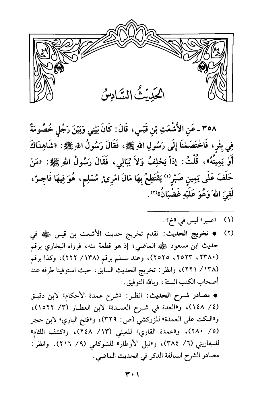 358 - عَنِ الأَشْعَثِ بْنِ قَيْسٍ، قَالَ: كَانَ بَيْنِي وَبَيْنَ رَجُلٍ خُصُومَةٌ فِي بِئْرٍ، فَاخْتَصَمْنَا إِلَى رَسُولِ اللَّهِ -صلى اللَّه عليه وسلم-، فَقَالَ رَسُولُ اللَّهِ -صلى اللَّه عليه وسلم-: "شَاهِدَاكَ أَوْ يَمِينُهُ"، قُلْتُ: إِذًا يَحْلِفُ وَلَا يُبَالِي، فَقَالَ رَسُولُ اللَّهِ -صلى اللَّه عليه وسلم-: "مَنْ حَلَفَ عَلَى يَمِينٍ صَبْرٍ (¬1) يَقْتَطِعُ بِهَا مَالَ امْرِىءٍ مُسْلِمٍ، هُوَ فِيهَا فَاجِرٌ، لَقِيَ اللَّهَ وَهُوَ عَلَيْهِ غَضْبَانُ" (¬2).
