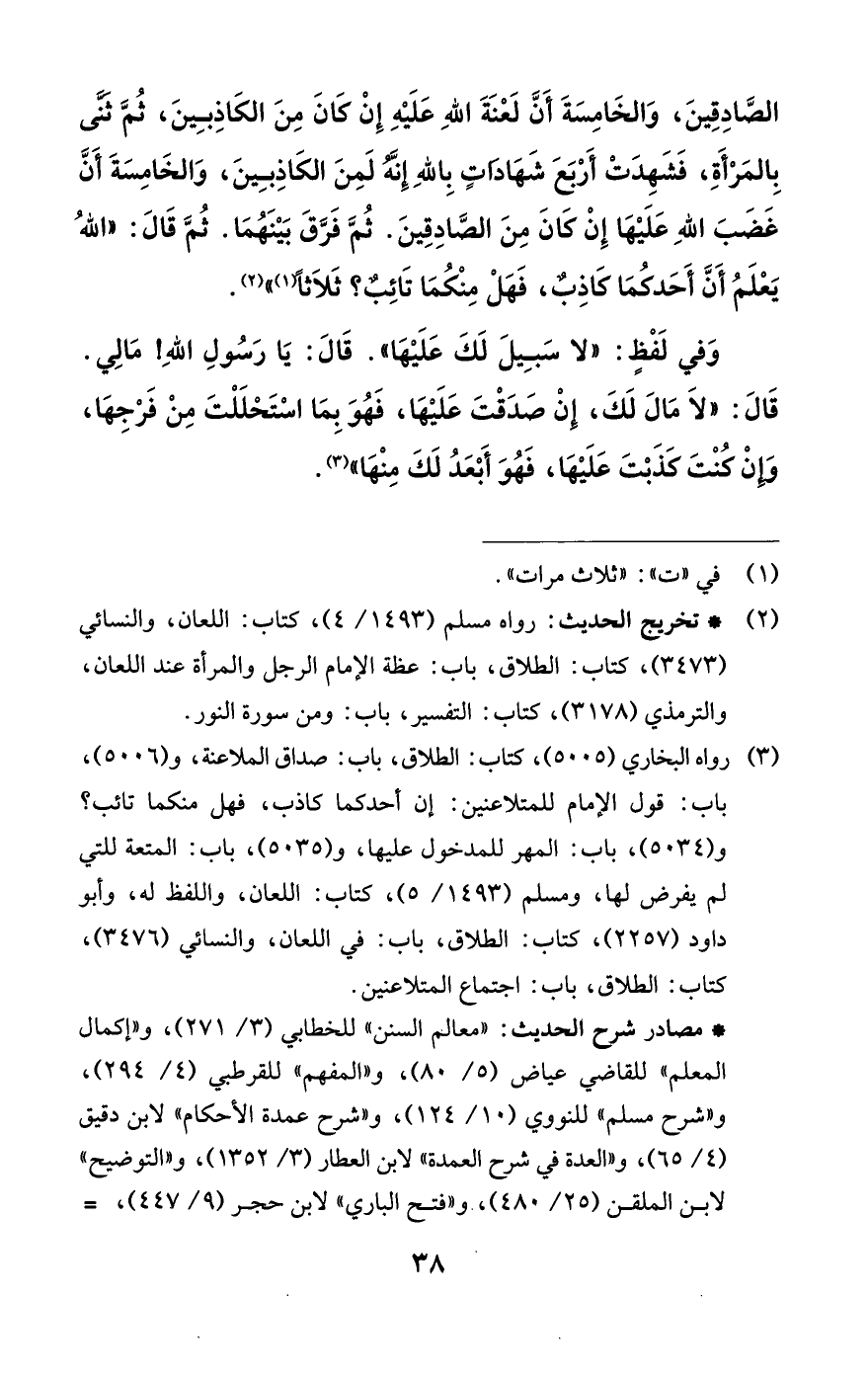 (¬3) رواه البخاري (5005)، كتاب: الطلاق، باب: صداق الملاعنة، و (5006)، باب: قول الإمام للمتلاعنين: إن أحدكما كاذب، فهل منكما تائب؟ و (5034)، باب: المهر للمدخول عليها، و (5035)، باب: المتعة للتي لم يفرض لها، ومسلم (1493/ 5)، كتاب: اللعان، واللفظ له، وأبو داود (2257)، كتاب: الطلاق، باب: في اللعان، والنسائي (3476)، كتاب: الطلاق، باب: اجتماع المتلاعنين.