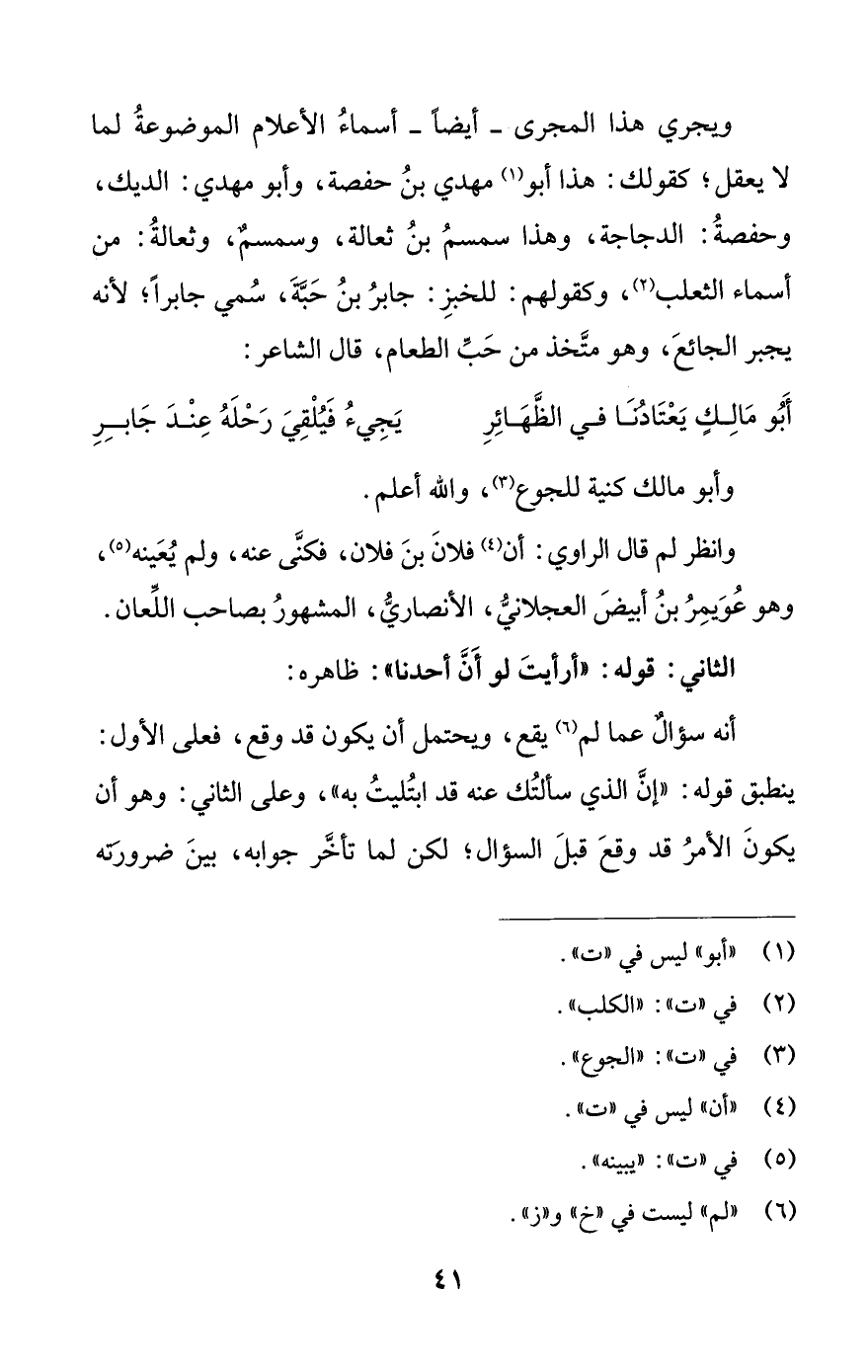 ويجري هذا المجرى -أيضًا- أسماءُ الأعلام الموضوعةُ لما لا يعقل؛ كقولك: هذا أبو (¬1) مهدي بنُ حفصة، وأبو مهدي: الديك، وحفصةُ: الدجاجة، وهذا سمسمُ بنُ ثعالة، وسمسمٌ، وثعالةُ: من أسماء الثعلب (¬2)، وكقولهم: للخبزِ: جابرُ بنُ حَبَّةَ، سُمي جابرًا؛ لأنه يجبر الجائعَ، وهو متَّخذ من حَبِّ الطعام، قال الشاعر:
