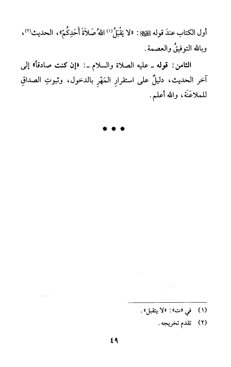 أول الكتاب عندَ قوله عليه السلام: "لا يَقْبَلُ (¬1) اللَّهُ صَلَاةَ أَحَدِكُمْ"، الحديث (¬2)، وباللَّه التوفيقُ والعصمة.