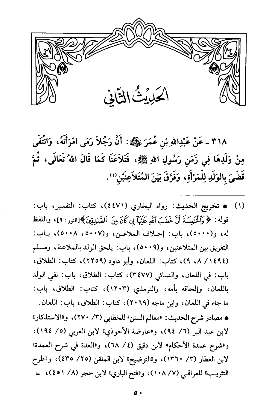 318 - عَنْ عَبْدِ اللَّهِ بنِ عُمَرَ -رضي اللَّه عنهما-: أَنَّ رَجُلًا رَمَى امْرَأَتَهُ، وَانْتَفَى مِنْ وَلَدِهَا في زَمَنِ رَسُولِ اللَّهِ -صلى اللَّه عليه وسلم-، فتَلَاعَنَا كَمَا قَالَ اللَّهُ تَعَالَى، ثُمَّ قَضَىَ بِالوَلَدِ لِلْمَرْأَةِ، وَفَرَّقَ بَيْنَ المُتَلَاعِنَيْنِ (¬1).