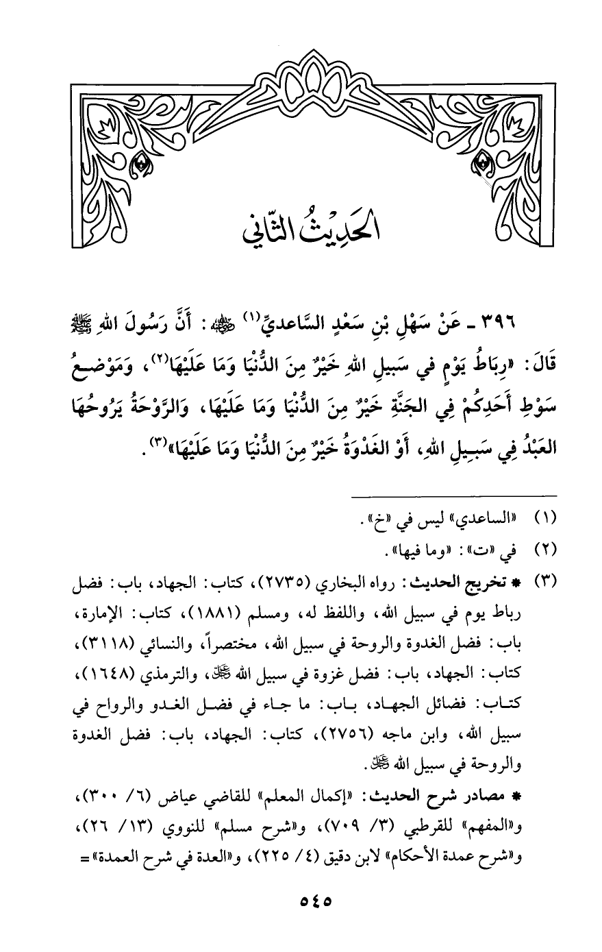 396 - عَنْ سَهْلِ بْنِ سَعْدٍ السَّاعديِّ (¬1) -رضي اللَّه عنه-: أَنَّ رَسُولَ اللَّهِ -صلى اللَّه عليه وسلم- قَالَ: "رِبَاطُ يَوْمٍ فِي سَبِيلِ اللَّهِ خَيْرٌ مِنْ الدُّنْيَا وَمَا عَلَيْهَا (¬2) , وَمَوْضِعُ سَوْطِ أَحَدِكُمْ فِي الْجَنَّةِ خَيْرٌ مِنْ الدُّنْيَا وَمَا عَلَيْهَا, وَالرَّوْحَةُ يَرُوحُهَا الْعَبْدُ فِي سَبِيلِ اللَّهِ وَالْغَدْوَةُ خَيْرٌ مِنْ الدُّنْيَا وَمَا عَلَيْهَا" (¬3).