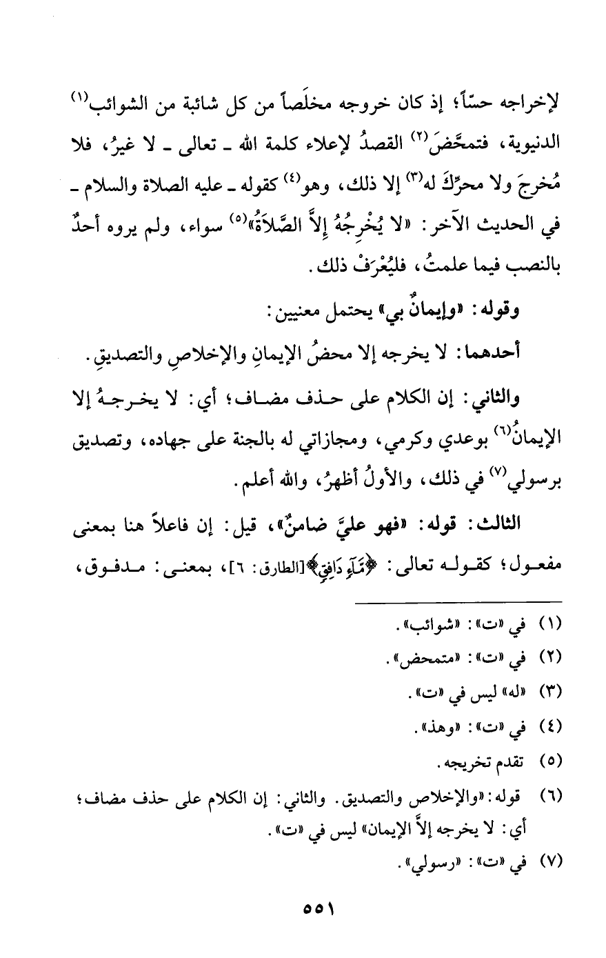 والثاني: إن الكلام على حذف مضاف، أي: لا يخرجهُ إلا الإيمانُ (¬6) بوعدي وكرمي، ومجازاتي له بالجنة على جهاده، وتصديق برسولي (¬7) في ذلك، والأولُ أظهرُ، واللَّه أعلم.