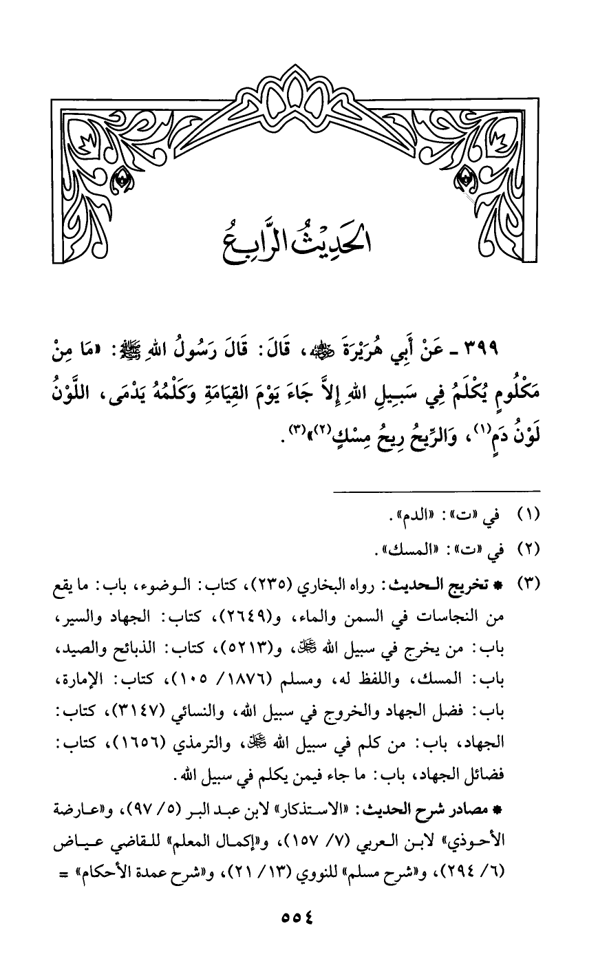 399 - عَنْ أَبِي هُرَيْرَةَ -رضي اللَّه عنه-، قَالَ: قَالَ رَسُولُ اللَّهِ -صلى اللَّه عليه وسلم-: "مَا مِنْ مَكْلُومٍ يُكْلَمُ فِي سَبِيلِ اللَّهِ, إلَّا جَاءَ يَوْمَ الْقِيَامَةِ وَكَلْمُهُ يَدْمَى، اللَّوْنُ لَوْنُ الدَّمِ (¬1) , وَالرِّيحُ رِيحُ مِسْكٍ (¬2) " (¬3).