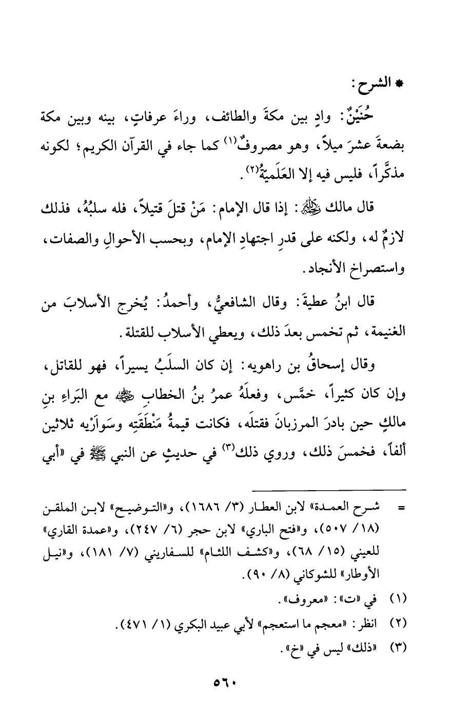 حُنَيْنٌ: وادٍ بين مكةَ والطائف، وراءَ عرفاتٍ، بينه وبين مكة بضعةَ عشرَ ميلًا، وهو مصروفٌ (¬1) كما جاء في القرآن الكريم؛ لكونه مذكَّرًا، فليس فيه إلا العَلَميّةُ (¬2).