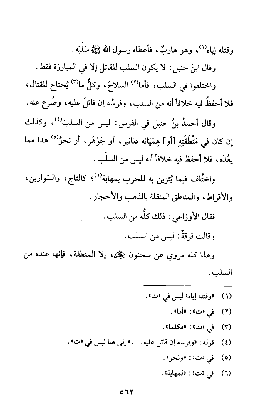 وقال أحمدُ بنُ حنبل في الفرس: ليس من السلبَ (¬4)، وكذلك إن كان في مَنْطَقَتِهِ [أو] هِمْيَانه دنانير، أو جَوْهَر، أو نحوُ (¬5) هذا مما يعُدّه، فلا أحفظ فيه خلافًا أنه ليس من السلَب.