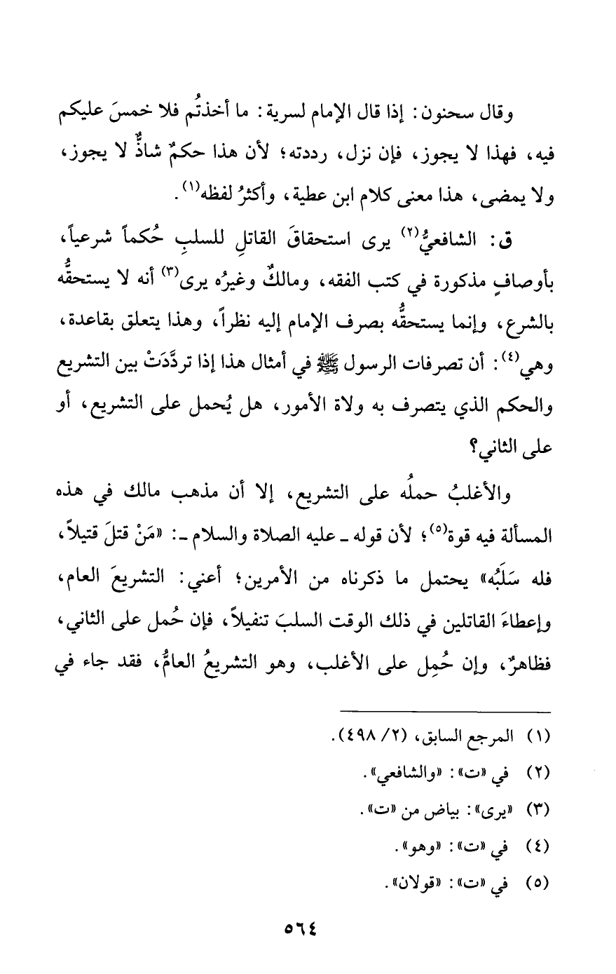 ق: الشافعيُّ (¬2) يرى استحقاقَ القاتلِ للسلبِ حُكمًا شرعيًا، بأوصافٍ مذكورة في كتب الفقه، ومالكٌ وغيرُه يرى (¬3) أنه لا يستحقُّه بالشرع، وإنما يستحقُّه بصرف الإمام إليه نظرًا، وهذا يتعلق بقاعدة، وهي (¬4): أن تصرفات الرسول -صلى اللَّه عليه وسلم- في أمثال هذا إذا تردَّدَتْ بين التشريع والحكم الذي يتصرف به ولاة الأمور، هل يُحمل على التشريع، أو على الثاني؟