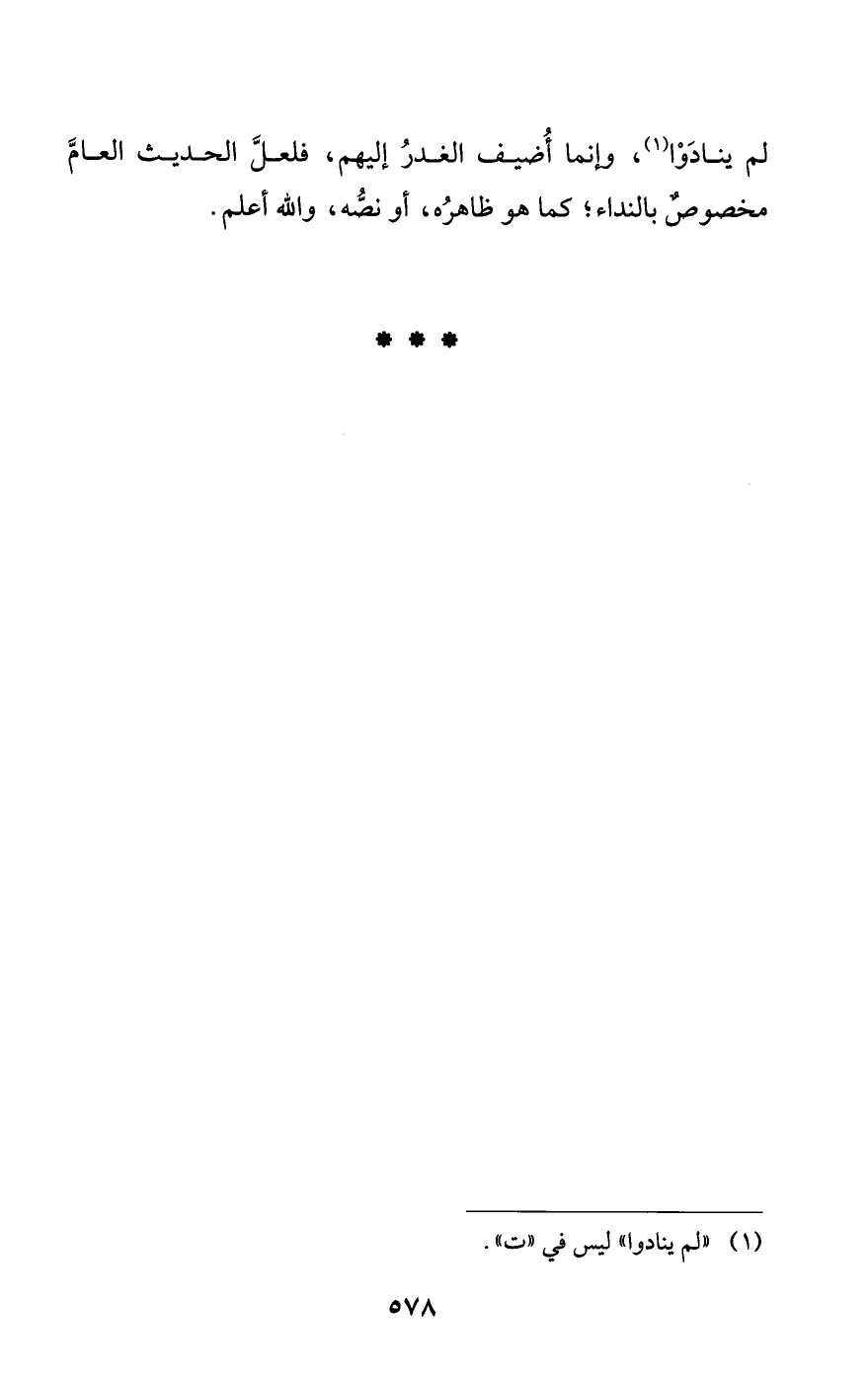 لم ينادَوْا (¬1)، وإنما أُضيف الغدرُ إليهم، فلعلَّ الحديث العامَّ مخصوصٌ بالنداء؛ كما هو ظاهرُه، أو نصُّه، واللَّه أعلم.