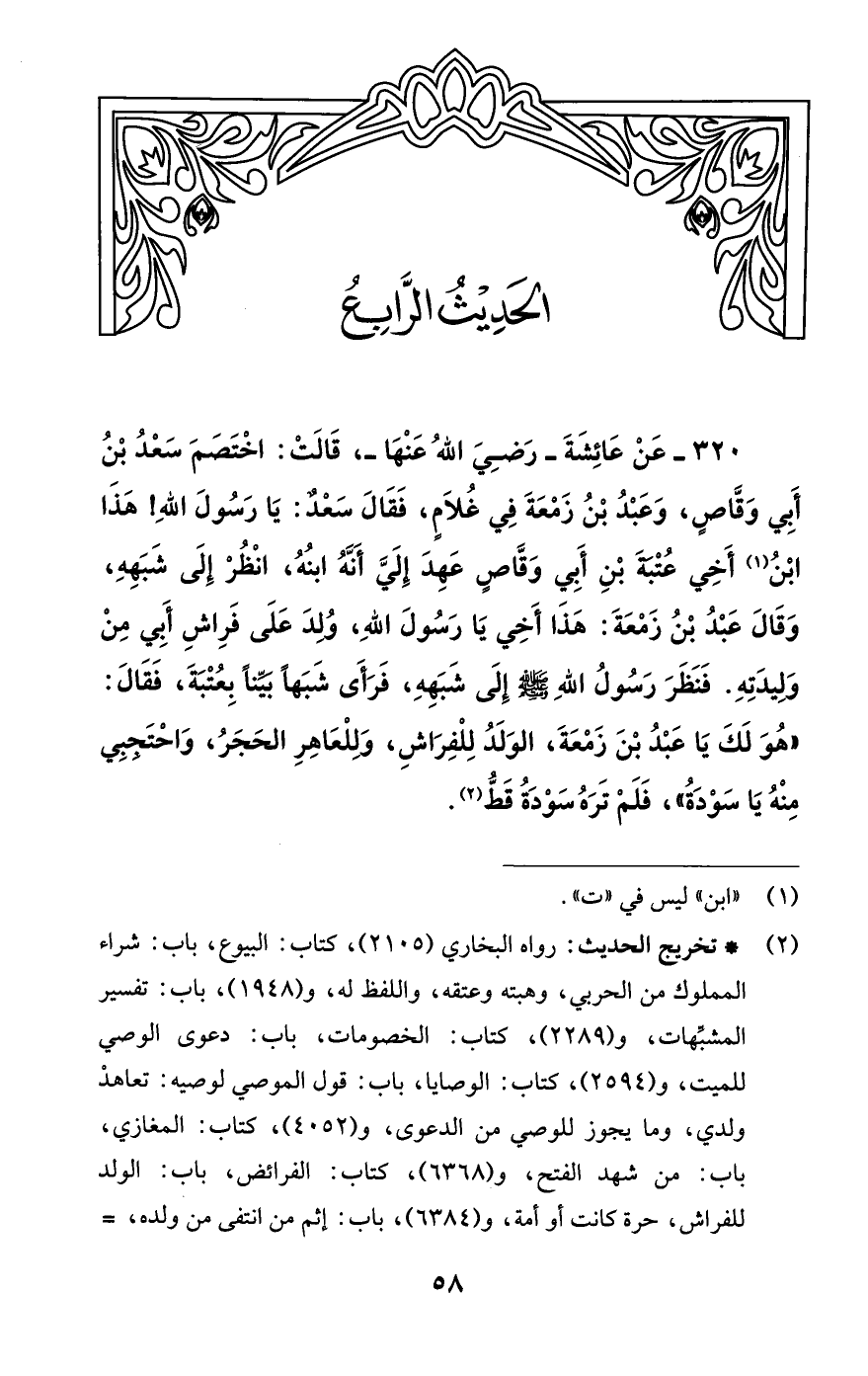 320 - عَنْ عَائِشَةَ -رَضِيَ اللَّهُ عَنْهَا-، قَالَتْ: اخْتَصَمَ سَعْدُ بْنُ أَبِي وَقَّاصٍ، وَعَبْدُ بنُ زَمْعَةَ في غُلَامٍ، فَقَالَ سَعْدٌ: يَا رَسُولَ اللَّهِ! هَذَا ابْنُ (¬1) أَخِي عُتْبَةَ بْنِ أَبِي وَقَّاصٍ عَهِدَ إِلَيَّ أَنَّهُ ابنُهُ، انْظُرْ إِلَى شَبَهِهِ، وَقَالَ عَبْدُ بْنُ زَمْعَةَ: هَذَا أَخِي يَا رَسُولَ اللَّهِ، وُلِدَ عَلَى فَرِاشِ أَبي مِنْ وَلِيدَتِهِ. فَنَظَرَ رَسُولُ اللَّهِ -صلى اللَّه عليه وسلم- إِلَى شَبَهِهِ، فَرَأَى شَبَهًا بيِّنًا بِعُتْبَةَ، فَقَالَ: "هُوَ لَكَ يَا عَبْدُ بْنَ زَمْعَةَ، الوَلَدُ لِلْفِرَاشِ، وَللْعَاهِرِ الحَجَرُ، وَاحْتَجبِي مِنْهُ يَا سَوْدَةُ"، فَلَمْ تَرَهُ سَوْدَةُ قَطُّ (¬2).