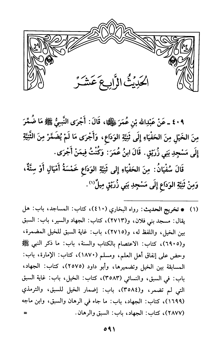 409 - عَنْ عَبْدِ اللَّه بْنِ عُمَرَ -رضي اللَّه عنهما-، قَالَ: أَجْرَى النَّبِيُّ -صلى اللَّه عليه وسلم- مَا ضُمِّرَ مِنَ الخَيْلِ مِنَ الحَفْيَاءَ إِلَى ثَنِيَّةِ الوَدَاعِ، وَأَجْرَى مَا لَمْ يُضَمَّرْ مِنَ الثَّنِيَّةِ إِلَى مَسْجدِ بَنِي زُريقٍ. قَالَ ابنُ عُمَرَ: وَكُنْتُ فِيمَنْ أَجْرَى.
