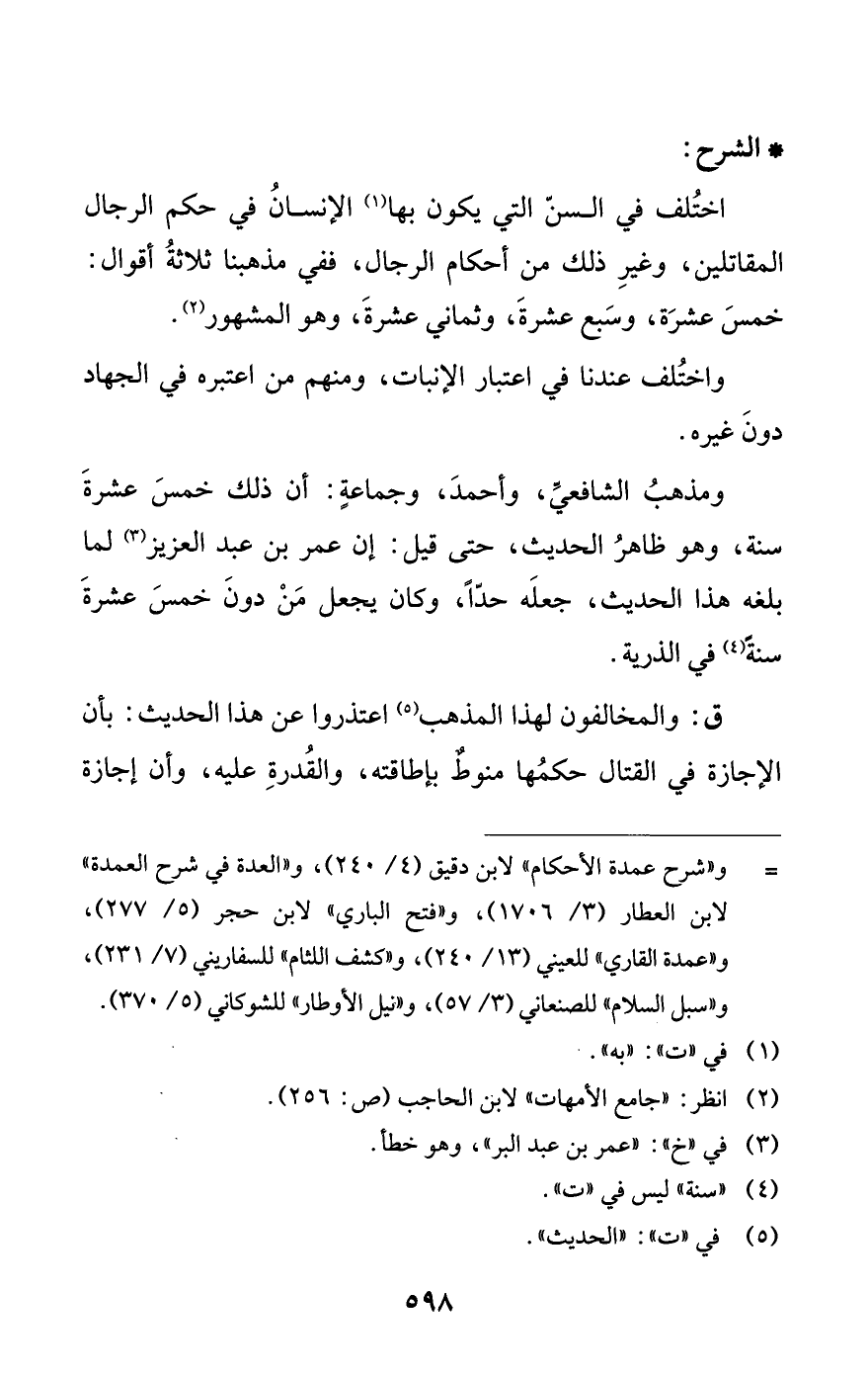 اختُلف في السنّ التي يكون بها (¬1) الإنسانُ في حكم الرجال المقاتلين، وغيرِ ذلك من أحكام الرجال، ففي مذهبنا ثلاثةُ أقوال: خمسَ عشرَة، وسَبع عشرةَ، وثماني عشرةَ، وهو المشهور (¬2).