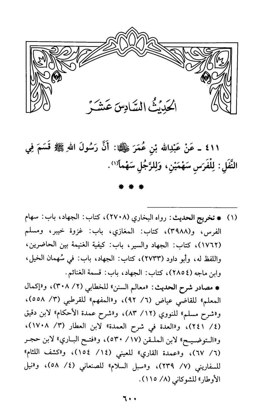 411 - عَنْ عَبْدِ اللَّه بْنِ عُمَرَ -رضي اللَّه عنهما-: أَنَّ رَسُولَ اللَّهِ -صلى اللَّه عليه وسلم- قَسَمَ فِي النَّفَلِ: لِلْفَرَسِ سَهْمَيْنِ، وَلِلرَّجُلِ سَهْمًا (¬1).