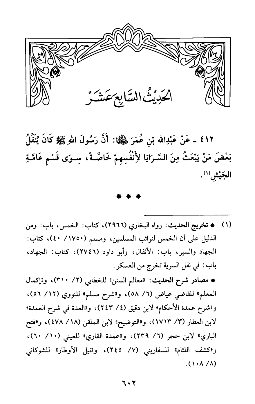 412 - عَنْ عَبْدِ اللَّه بْنِ عُمَرَ -رضي اللَّه عنهما-: أَنَّ رَسُولَ اللَّهِ -صلى اللَّه عليه وسلم- كَانَ يُنَفِّلُ بَعْضَ مَنْ يَبْعَثُ مِنَ السَّرَايَا لأِنْفُسِهِمْ خَاصَّةً، سِوَى قَسْم عَامَّةِ الجَيْشِ (¬1).