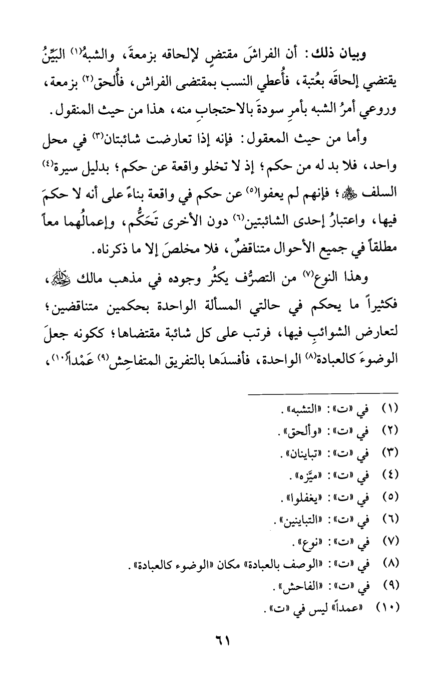وهذا النوع (¬7) من التصرُّف يكثُر وجوده في مذهب مالك رحمه اللَّه، فكثيرًا ما يحكم في حالتي المسألة الواحدة بحكمين متناقضين؛ لتعارض الشوائبِ فيها، فرتب على كل شائبة مقتضاها؛ ككونه جعلَ الوضوءَ كالعبادة (¬8) الواحدة، فأفسدَها بالتفريق المتفاحِش (¬9) عَمْدًا (¬10)،