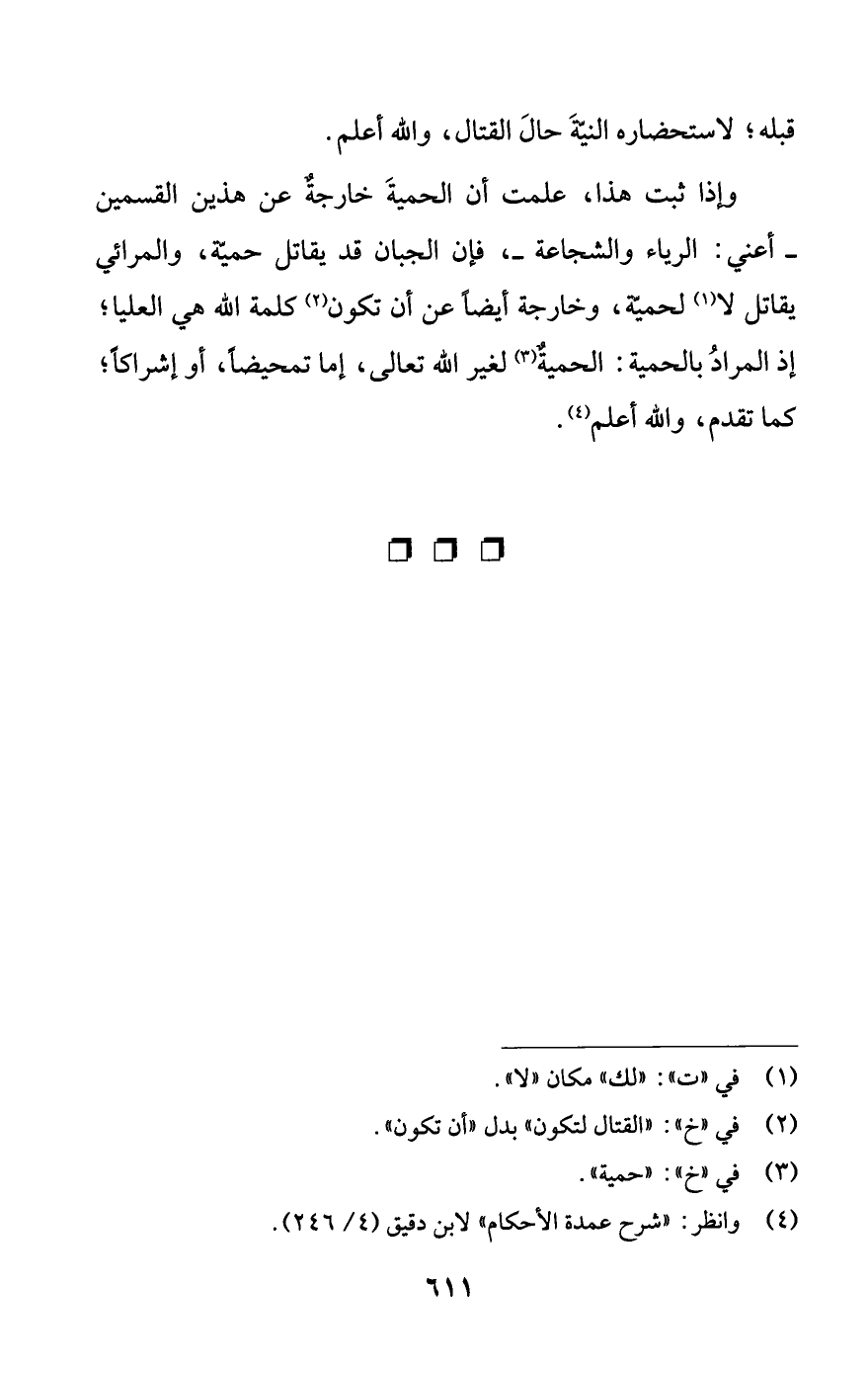 وإذا ثبت هذا، علمت أن الحميةَ خارجةٌ عن هذين القسمين -أعني: الرياء والشجاعة-، فإن الجبان قد يقاتل حميّة، والمرائي يقاتل لا (¬1) لحميّة، وخارجة أيضًا عن أن تكون (¬2) كلمة اللَّه هي العليا؛ إذ المرادُ بالحمية: الحميةٌ (¬3) لغير اللَّه تعالى، إما تمحيضًا، أو إشراكًا كما تقدم، واللَّه أعلم (¬4).