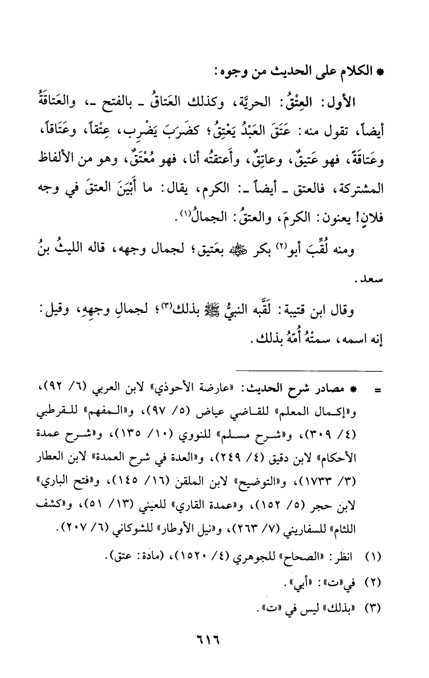 الأول: العِتْقُ: الحريَّة، وكذلك العَتاقُ -بالفتح-، والعَتاقَةُ أيضًا، تقول منه: عَتَقَ العَبْدُ يَعْتِقُ؛ كضَرَبَ يَضْرِب، عِتْقًا، وعَتَاقًا، وعَتاقَةً، فهو عَتيقٌ، وعاتِقٌ، وأَعتقتُه أنا، فهو مُعْتَقٌ، وهو من الألفاظ المشتركة، فالعتق -أيضًا-: الكرم، يقال: ما أَبْيَنَ العتقَ في وجه فلانٍ! يعنون: الكرمَ، والعتقُ: الجمالُ (¬1).