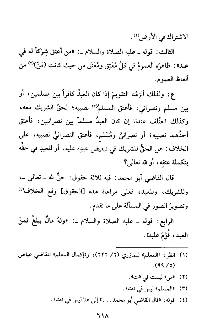 قال القاضي أبو محمد: فيه ثلاثة حقوق: حقٌّ للَّه -تعالى-، وللشريك، وللعبد، فعلى مراعاة هذه [الحقوق] وقع الخلاف (¬4) وتصويرُ الصور في المسألة على ما تقدم.