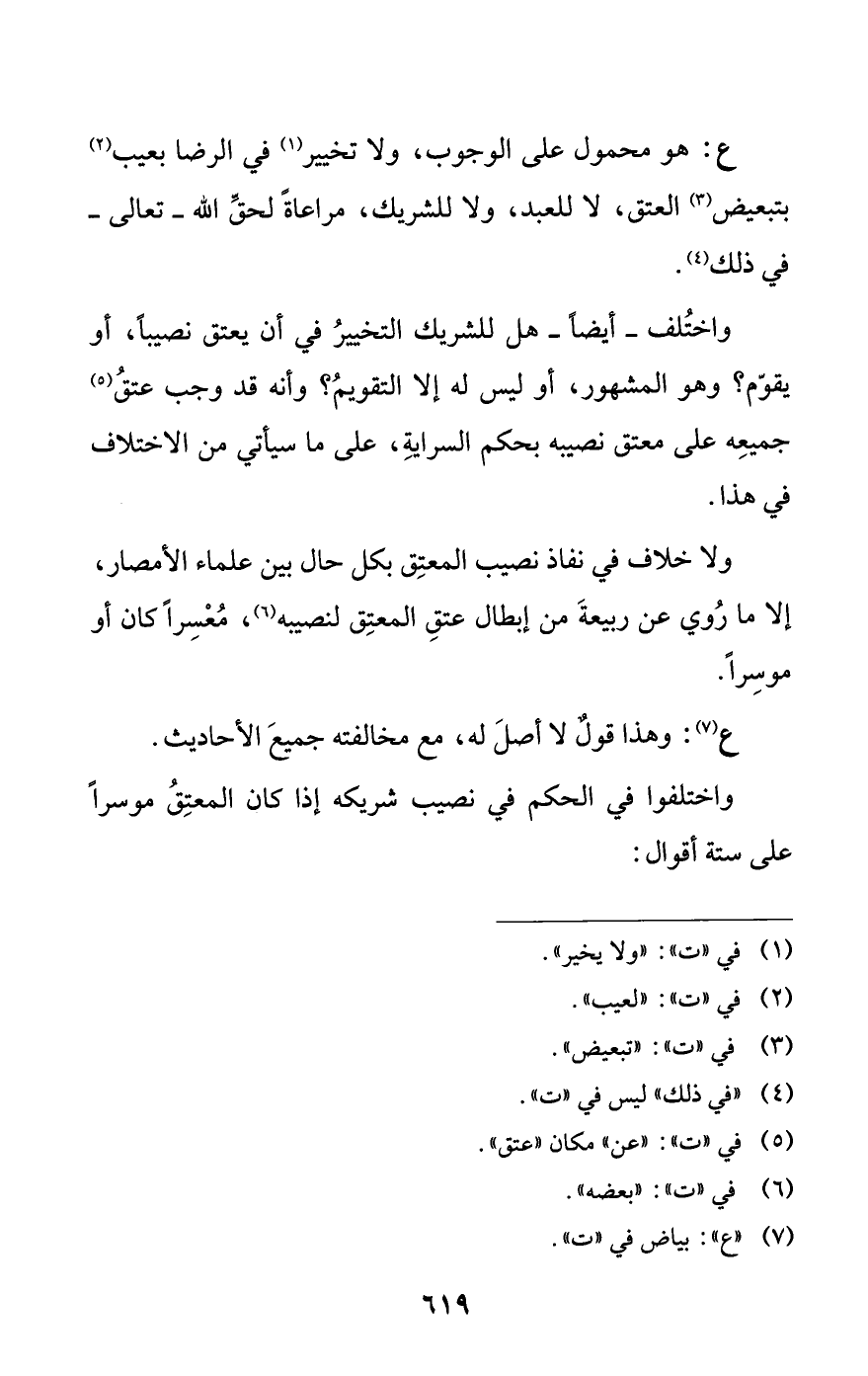 ع: هو محمول على الوجوب، ولا تخيير (¬1) في الرضا بعيب (¬2) بتبعيض (¬3) العتق، لا للعبد، ولا للشريك، مراعاةً لحقِّ اللَّه -تعالى- في ذلك (¬4).