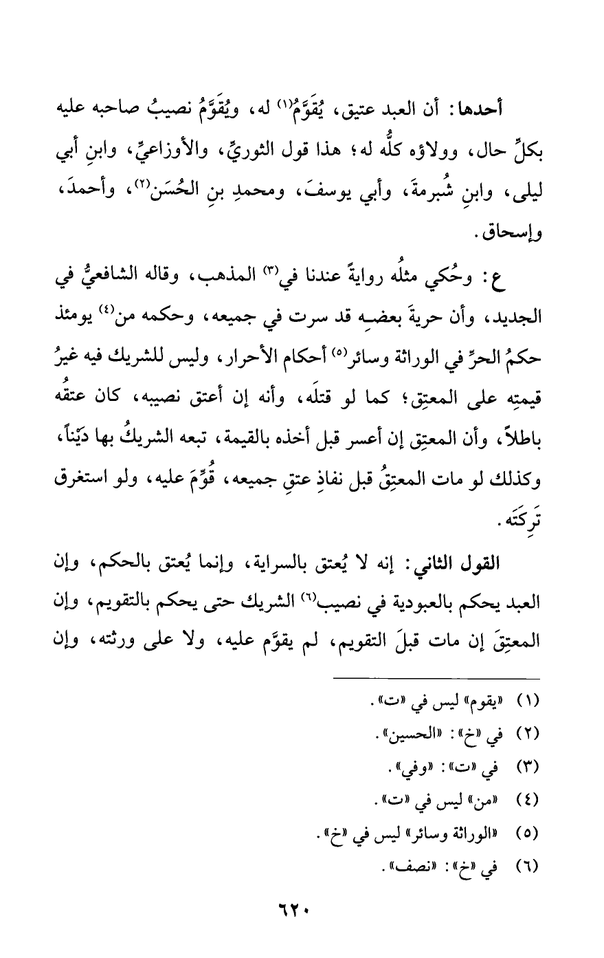 أحدها: أن العبد عتيق، يُقَوَّمُ (¬1) له، ويُقَوَّمُ نصيبُ صاحبه عليه بكلِّ حال، وولاؤه كلُّه له؛ هذا قول الثوريِّ، والأوزاعيِّ، وابنِ أبي ليلى، وابنِ شُبرمةَ، وأبي يوسفَ، ومحمدِ بنِ الحُسَن (¬2)، وأحمدَ، وإسحاق.