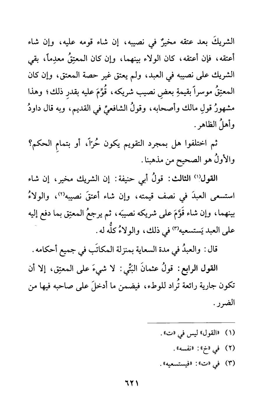 القول (¬1) الثالث: قولُ أبي حنيفة: إن الشريك مخير، إن شاء استسعى العبدَ في نصف قيمته، وإن شاء أعتقَ نصيبه (¬2)، والولاءُ بينهما، وإن شاء قَوَّمَ على شريكه نصيبَه، ثم يرجعُ المعتِق بما دفع إليه على العبد يَستسعيه (¬3) في ذلك، والولاءُ كلُّه له.