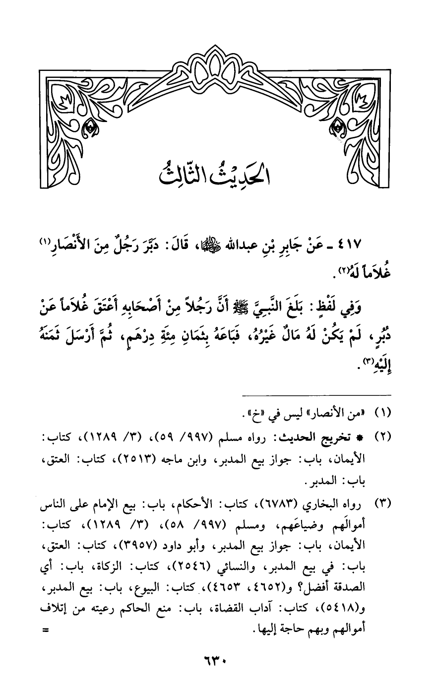 417 - عَنْ جَابِرِ بْنِ عبد اللَّه -رضي اللَّه عنهما-، قَالَ: دَبَّرَ رَجُلٌ مِنَ الأَنْصَارِ (¬1) غُلَامًا لَهُ (¬2).
