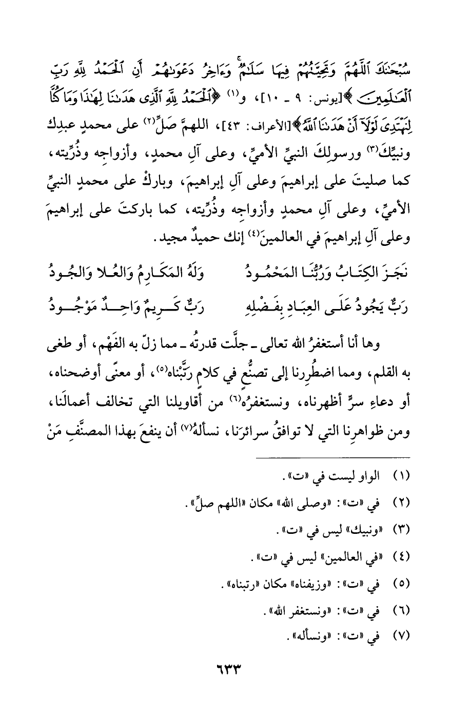 سُبْحَانَكَ اللَّهُمَّ وَتَحِيَّتُهُمْ فِيهَا سَلَامٌ وَآخِرُ دَعْوَاهُمْ أَنِ الْحَمْدُ لِلَّهِ رَبِّ الْعَالَمِينَ} [يونس: 9 - 10]، و (¬1) {الْحَمْدُ لِلَّهِ الَّذِي هَدَانَا لِهَذَا وَمَا كُنَّا لِنَهْتَدِيَ لَوْلَا أَنْ هَدَانَا اللَّهُ} [الأعراف: 43]، اللهمَّ صَلِّ (¬2) على محمدٍ عبدِك ونبيِّكَ (¬3) ورسولكَ النبيِّ الأميِّ، وعلى آلِ محمدٍ، وأزواجِه وذُرِّيته، كما صليتَ على إبراهيمَ وعلى آلِ إبراهيمَ، وباركْ على محمدٍ النبيِّ الأميِّ، وعلى آلِ محمدٍ وأزواجِه وذُرِّيته، كما باركتَ على إبراهيمَ وعلى آلِ إبراهيمَ في العالمينَ (¬4) إنك حميدٌ مجيد.