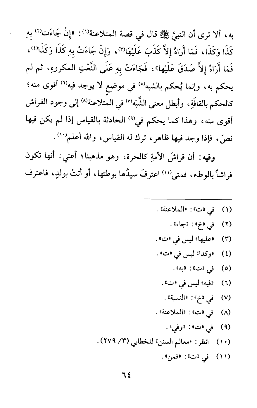 به، ألا ترى أن النبيَّ -صلى اللَّه عليه وسلم- قال في قصة المتلاعنة (¬1): "إِنْ جَاءَت (¬2) بِهِ كَذَا وَكَذَا، فَمَا أَرَاهُ إِلَّا كَذَبَ عَلَيْهَا (¬3)، وَإِنْ جَاءَتْ بِهِ كَذَا وَكَذَا (¬4)، فَمَا أَرَاهُ إِلَّا صَدَقَ عَلَيْها"، فَجَاءَتْ بِهِ عَلَى النَّعْتِ المكروهِ، ثم لم يحكم به، وإنما يُحكم بالشبه (¬5) في موضعٍ لا يوجد فيه (¬6) أقوى منه؛ كالحكم بالقافَةِ، وأبطل معنى الشَّبَه (¬7) في المتلاعنة (¬8) إلى وجود الفراش أقوى منه، وهذا كما يحكم في (¬9) الحادثة بالقياس إذا لم يكن فيها نصّ، فإذا وجد فيها ظاهر، ترك له القياس، واللَّه أعلم (¬10).