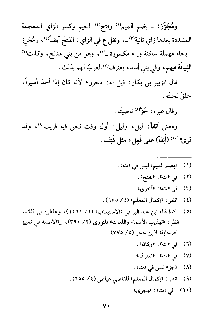 ومُجَزِّز: -بضم الميم (¬1) وفتح (¬2) الجيم وكسر الزاي المعجمة المشددة بعدها زاي ثانية (¬3) -، ونقل ع في الزاي: الفتحَ أيضًا (¬4)، ومُحْرِز -بحاء مهملة ساكنة وراء مكسورة- (¬5)، وهو من بني مدلج، وكانت (¬6) القِيافَة فيهم، وفي بني أسد، يعترف (¬7) العربُ لهم بذلك.