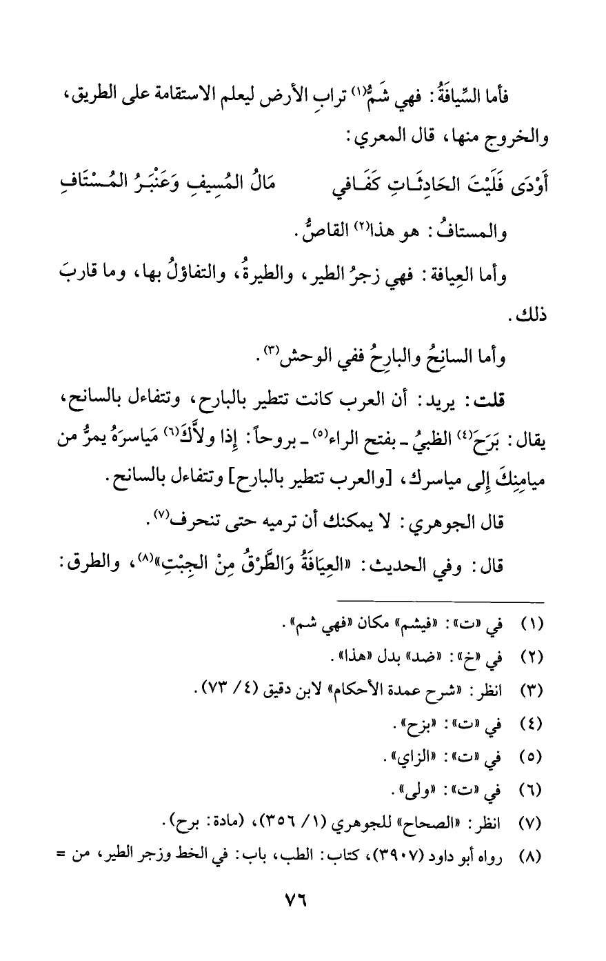 فأما السِّيافَةُ: فهي شَمُّ (¬1) ترابِ الأرض ليعلم الاستقامة على الطريق، والخروج منها، قال المعري: