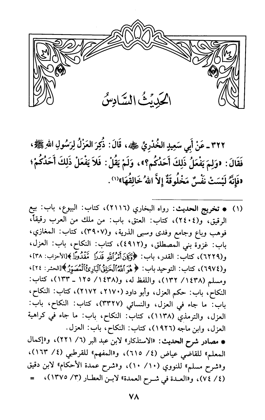 322 - عَنْ أَبِي سَعِيدٍ الخُدْرِيِّ -رضي اللَّه عنه-، قَالَ: ذُكِرَ العَزْلُ لِرَسُولِ اللَّهِ -صلى اللَّه عليه وسلم-، فَقَالَ: "وَلِمَ يَفْعَلُ ذَلِكَ أَحَدُكُم؟ "، وَلَمْ يَقُلْ: فَلَا يَفْعَلْ ذَلِكَ أَحَدُكُمْ؛ "فَإِنَّهُ لَيْسَتْ نَفْسٌ مَخْلُوقَةٌ إِلَّا اللَّهُ خَالِقُهَا" (¬1).