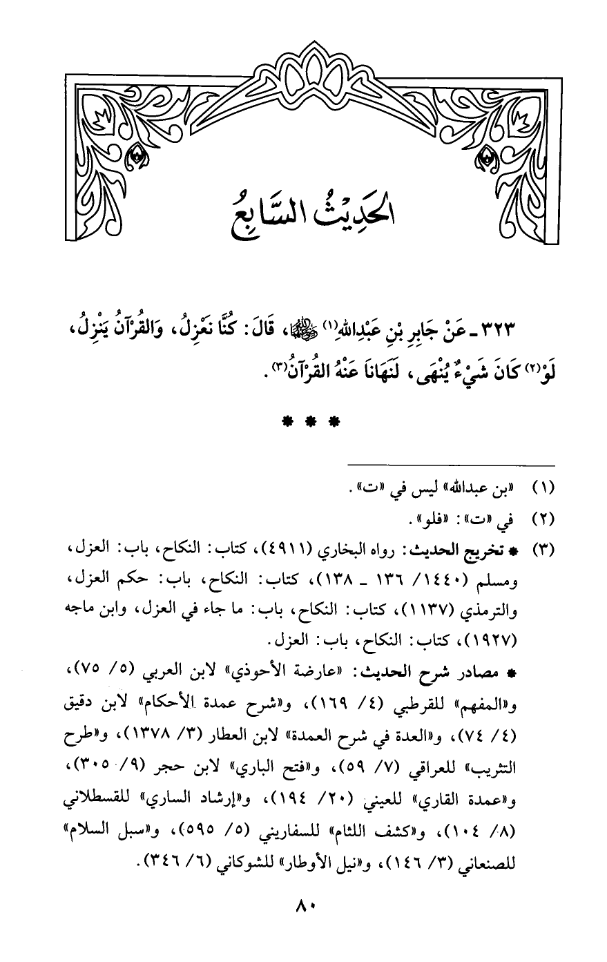 323 - عَنْ جَابِرِ بْنِ عَبْدِ اللَّه (¬1) -رضي اللَّه عنهما-، قَالَ: كُنَّا نَعْزِلُ، وَالقُرْآنُ يَنْزِلُ، لَوْ (¬2) كَانَ شَيْءٌ يُنْهَى، لنهَانَا عَنْهُ القُرْآنُ (¬3).