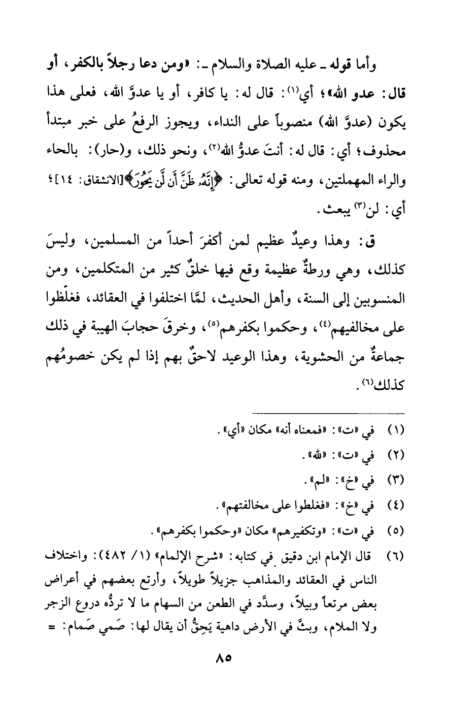 ق: وهذا وعيدٌ عظيم لمن أكفرَ أحدًا من المسلمين، وليسَ كذلك، وهي ورطةٌ عظيمة وقع فيها خلقٌ كثير من المتكلمين، ومن المنسوبين إلى السنة، وأهل الحديث، لمَّا اختلفوا في العقائد، فغلّظوا على مخالفيهم (¬4)، وحكموا بكفرهم (¬5)، وخرقَ حجابَ الهيبة في ذلك جماعةٌ من الحشوية، وهذا الوعيد لاحقٌ بهم إذا لم يكن خصومُهم كذلك (¬6).