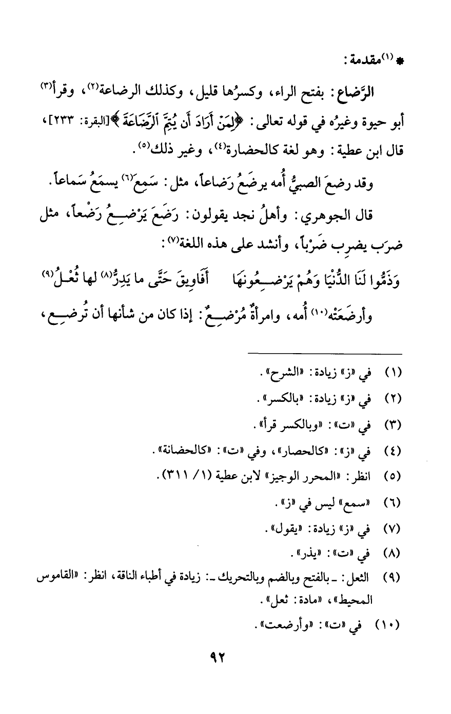 الرَّضاع: بفتح الراء، وكسرُها قليل، وكذلك الرضاعة (¬2)، وقرأ (¬3) أبو حيوة وغيرُه في قوله تعالى: {لِمَنْ أَرَادَ أَنْ يُتِمَّ الرَّضَاعَةَ} [البقرة: 233] , قال ابن عطية: وهو لغة كالحضارة (¬4)، وغير ذلك (¬5).