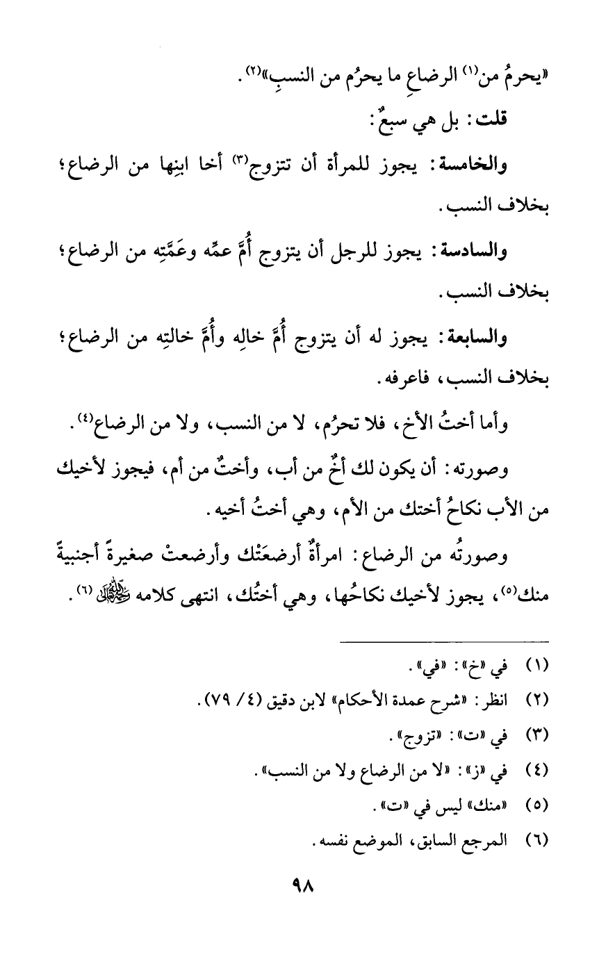 والسادسة: يجوز للرجل أن يتزوج أُمَّ عمِّه وعَمَّتِه من الرضاع؛ بخلاف النسب.