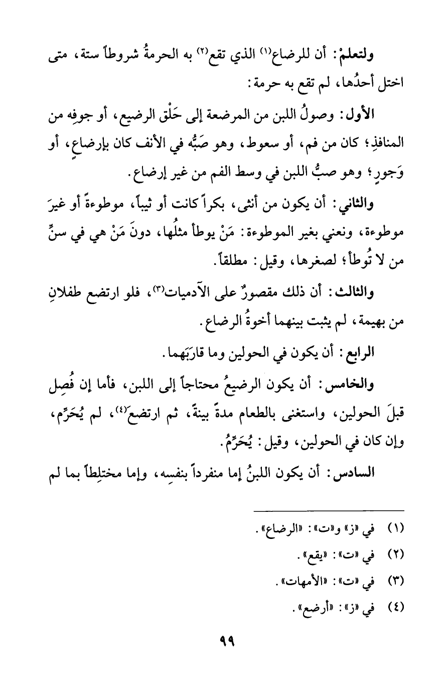 ولتعلمْ: أن للرضاع (¬1) الذي تقع (¬2) به الحرمةُ شروطًا ستة، متى اختل أحدُها، لم تقع به حرمة: