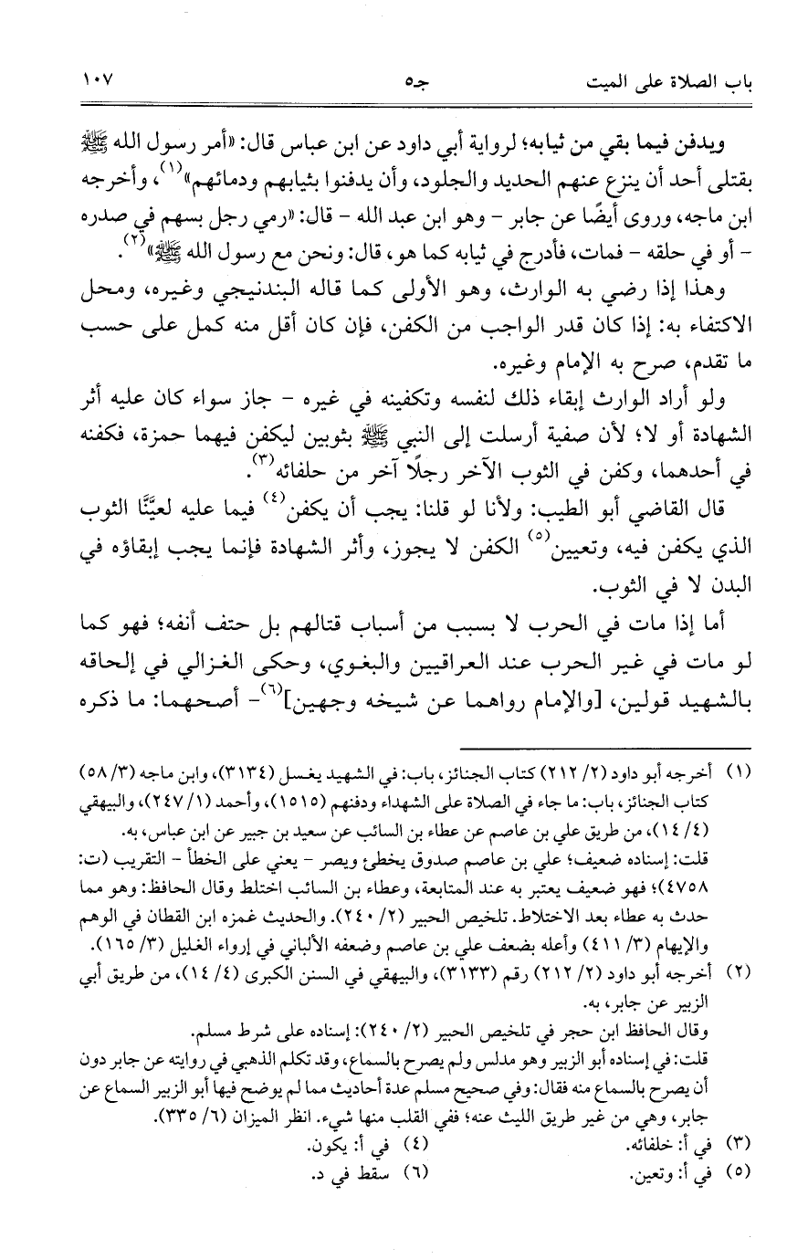 ويدفن فيما بقي من ثيابه؛ لرواية أبي داود عن ابن عباس قال: "أمر رسول الله - صلى الله عليه وسلم - بقتلى أحد أن ينزع عنهم الحديد والجلود، وأن يدفنوا بثيابهم ودمائهم"، وأخرجه ابن ماجه، وروى أيضاً عن جابر- وهو ابن عبد الله- قال: "رمي رجل بسهم في صدره- أو في حلقه- فمات، فأدرج في ثيابه كما هو، قال: ونحن مع رسول الله - صلى الله عليه وسلم - ".