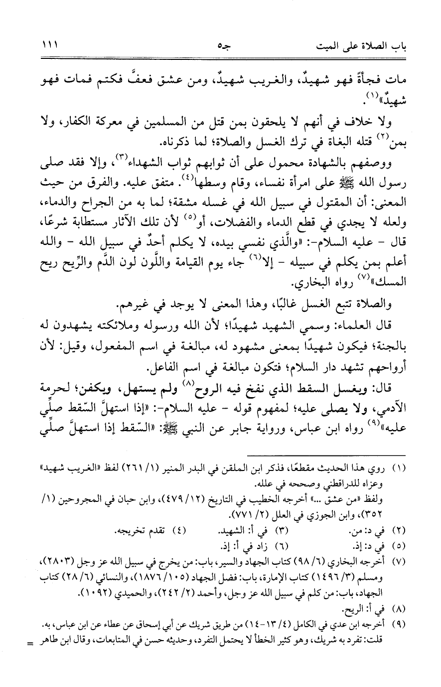 ووصفهم بالشهادة محمول على أن ثوابهم ثواب الشهداء، وإلا فقد صلى رسول الله - صلى الله عليه وسلم - على امرأة نفساء، وقام وسطها. متفق عليه. والفرق من حيث المعنى: أن المقتول في سبيل الله في غسله مشقة؛ لما به من الجراح والدماء، ولعله لا يجدي في قطع الدماء والفضلات، أو لأن تلك الآثار مستطابة شرعاً، قال- عليه السلام-: "والذي نفسي بيده لا يكلم أحد في سبيل الله- والله أعلم بمن يكلم في سبيله- إلا جاء يوم القيامة واللون لون الدم والريح ريح المسك" رواه البخاري.