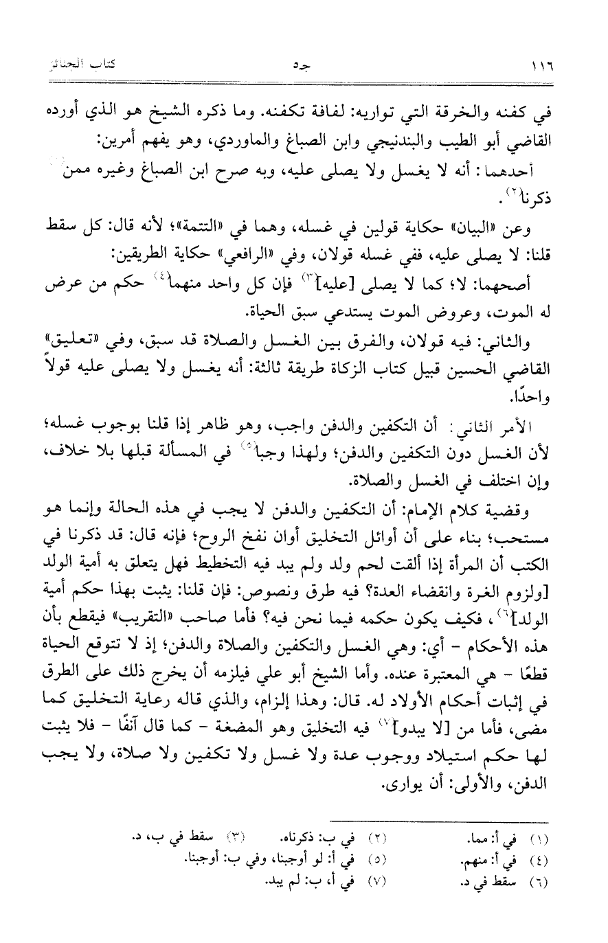 وقضية كلام الإمام: أن التكفين والدفن لا يجب في هذه الحالة وإنما هو مستحب؛ بناء على أن أوائل التخليق أوان نفخ الروح؛ فإنه قال: قد ذكرنا في الكتب أن المرأة إذا ألقت لحم ولد ولم يبد فيه التخطيط فهل يتعلق به أمية الولد [ولزوم الغرة وانقضاء العدة؟ فيه طرق ونصوص: فإن قلنا: يثبت بهذا حكم أمية الولد]، فكيف يكون حكمه فيما نحن فيه؟ فأما صاحب "التقريب" فيقطع بأن هذه الأحكام- أي: وهي الغسل والتكفين والصلاة والدفن؛ إذ لا تتوقع الحياة قطعاً- هي المعتبرة عنده. وأما الشيخ أبو علي فيلزمه أن يخرج ذلك على الطرق في إثبات أحكام الأولاد له. قال: وهذا إلزام، والذي قاله رعاية التخليق كما مضى، فأما من [لا يبدو] فيه التخليق وهو المضغة- كما قال آنفاً- فلا يثبت لها حكم استيلاد ووجوب عدة ولا غسل ولا تكفين ولا صلاة، ولا يجب الدفن، والأولى: أن يوارى.