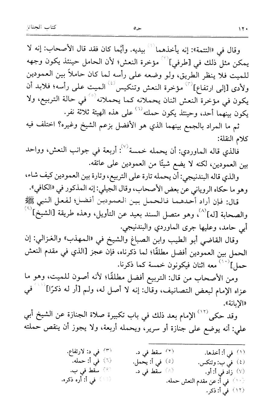 وقد حكى الإمام بعد ذلك في باب تكبيرة صلاة الجنازة عن الشيخ أبي علي: أنه يوضع على جنازة أو سرير، ويحمله أربعة، ولا يجوز أن ينقص حملته