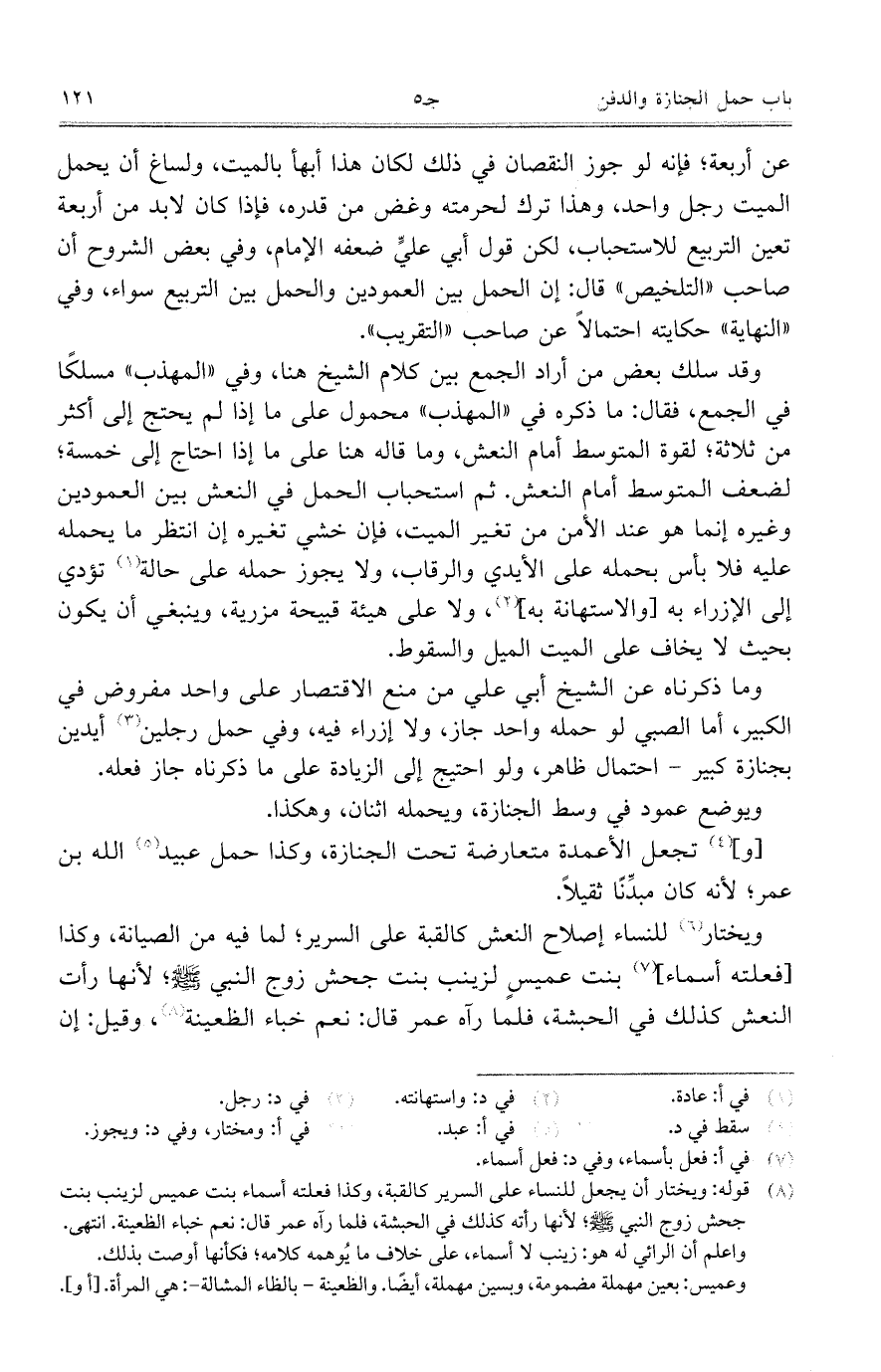 وقد سلك بعض من أراد الجمع بين كلام الشيخ هنا، وفي "المهذب" مسلكاً في الجمع، فقال: ما ذكره في "المهذب" محمول على ما إذا لم يحتج إلى أكثر من ثلاثة؛ لقوة المتوسط أمام النعش، وما قاله هنا على ما إذا احتاج إلى خمسة؛ لضعف المتوسط أمام النعش. ثم استحباب الحمل في النعش بين العمودين وغيره إنما هو عند الأمن من تغير الميت، فإن خشي تغيره إن انتظر ما يحمله عليه فلا بأس بحمله على الأيدي والرقاب، ولا يجوز حمله على حالة تؤدي إلى الإزراء به [والاستهانة به]، ولا على هيئة قبيحة مزرية، وينبغي أن يكون بحيث لا يخاف على الميت الميل والسقوط.