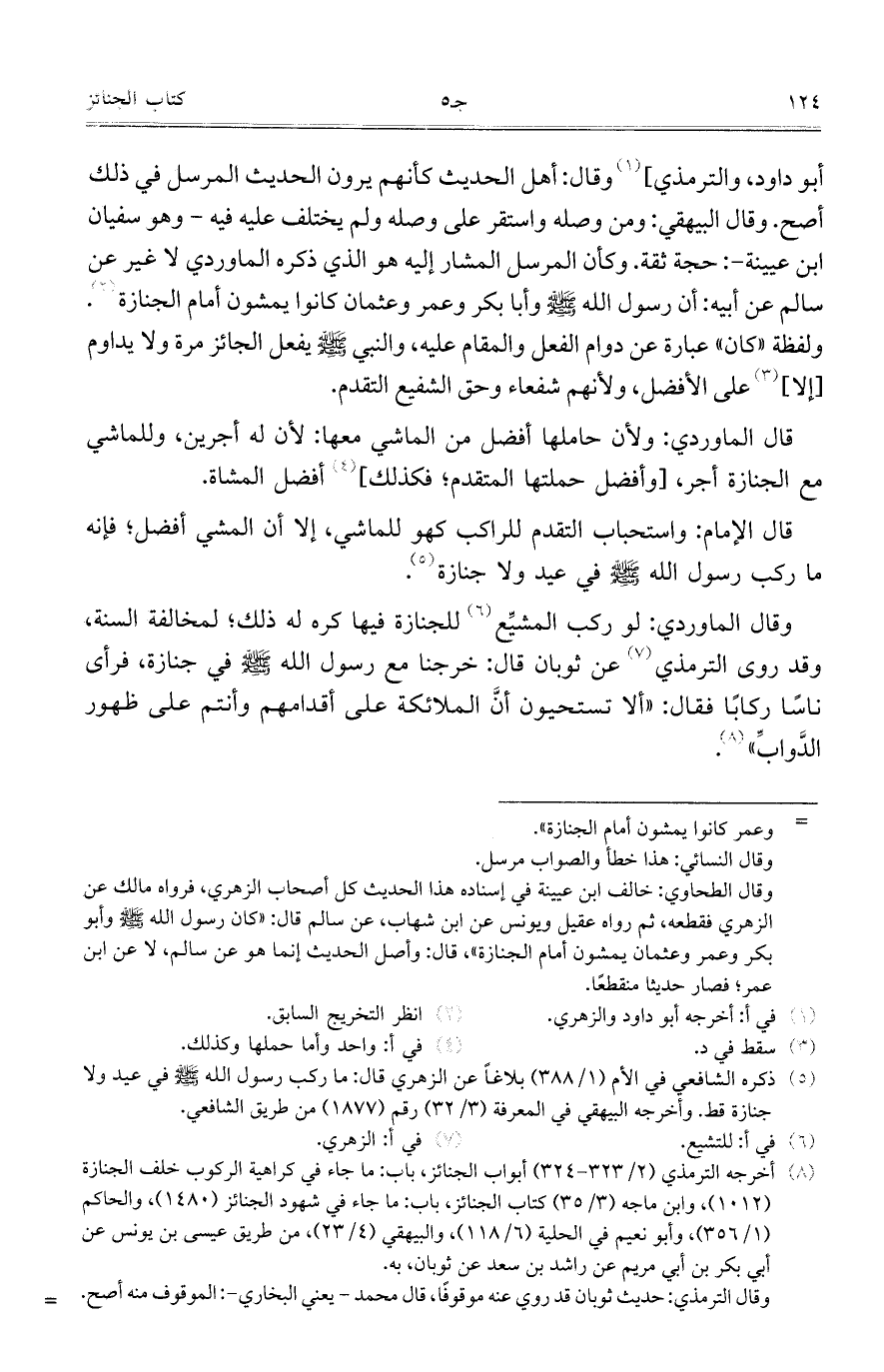 أبو داود، والترمذي] وقال: أهل الحديث كانهم يرون الحديث المرسل في ذلك أصح. وقال البيهقي: ومن وصله واستقر على وصله ولم يختلف عليه فيه- وهو سفيفان ابن عيينة-: حجة ثقة. وكأن المرسل المشار إليه هو الذي ذكره الماوردي لا غير عن سالم عن أبيه: أن رسول الله - صلى الله عليه وسلم - وأبا بكر وعمر وعثمان كانوا يمشون أمام الجنازة. ولفظة "كان" عبارة عن دوام الفعل والمقام عليه، والنبي - صلى الله عليه وسلم - يفعل الجائز مرة ولا يداوم [إلا] على الأفضل، ولأنهم شفعاء وحق الشفيع التقدم.