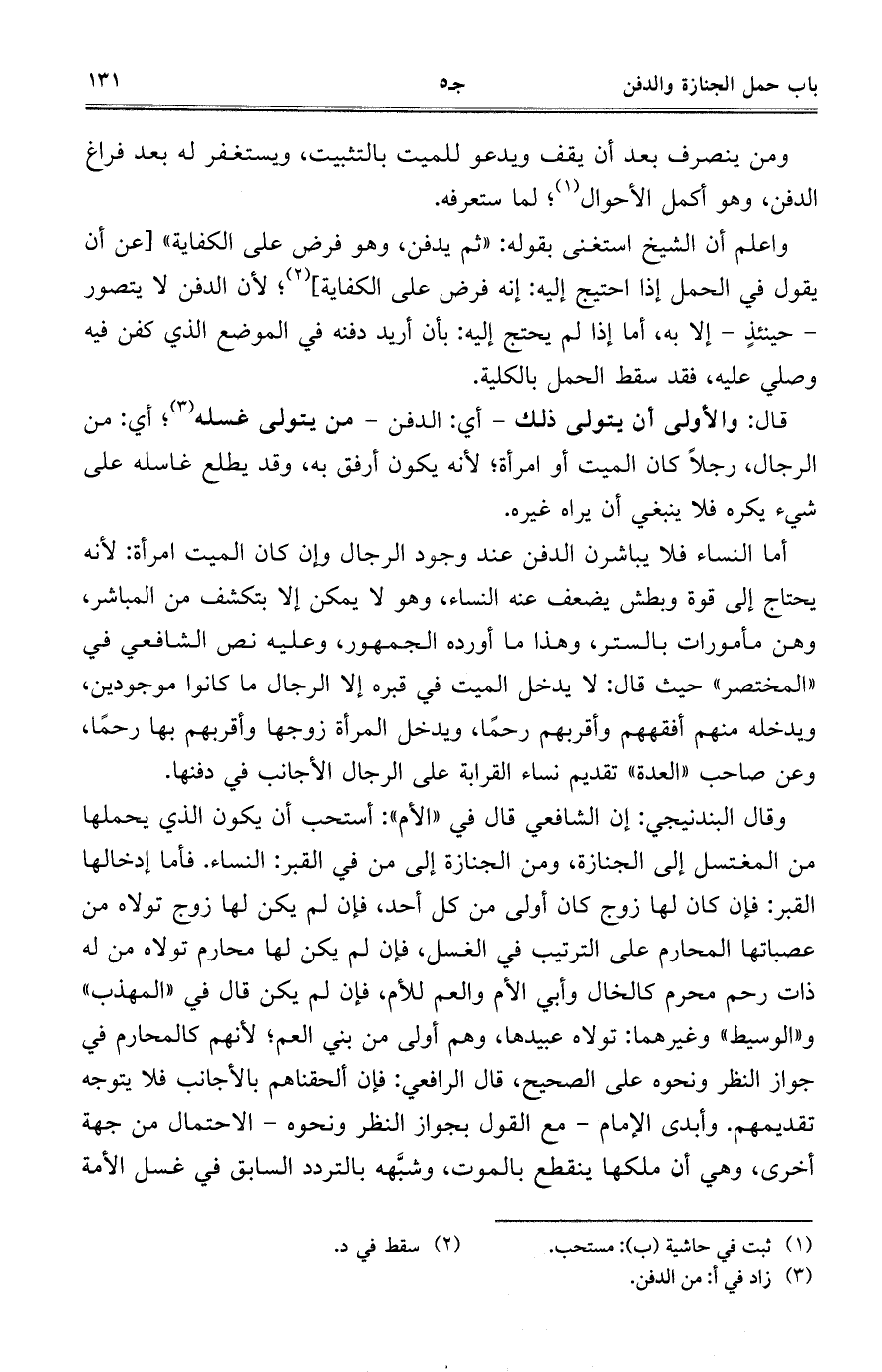 واعلم أن الشيخ استغنى بقوله: "ثم يدفن، وهو فرض على الكفاية" [عن أن يقول في الحمل إذا احتيج إليه: إنه فرض على الكفاية]؛ لأن الدفن لا يتصور- حينئذ- إلا به، أما إذا لم يحتج إليه: بأن أريد دفنه في الموضع الذي كفن فيه وصلي عليه، فقد سقط الحمل بالكلية.