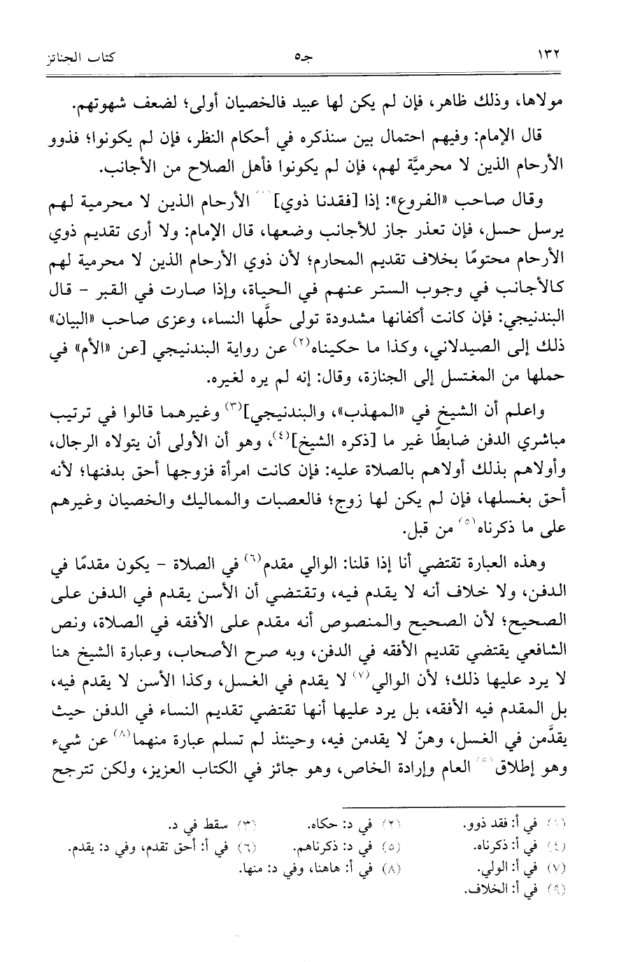 وهذه العبارة تقتضي أنا إذا قلنا: الوالي مقدم في الصلاة- يكون مقدماً في الدفن، ولا خلاف أنه لا يقدم فيه، وتقتضي أن الأسن يقدم في الدفن على الصحيح؛ لأن الصحيح والمنصوص أنه مقدم على الأفقه في الصلاة، ونص الشافعي يقتضي تقديم الأفقه في الدفن، وبه صرح الأصحاب، وعبارة الشيخ هنا لا يرد عليها ذلك؛ لأن الوالي لا يقدم في الغسل، وكذا الأسن لا يقدم فيه، بل المقدم فيه الأفقه، بل يرد عليها أنها تقتضي تقديم النساء في الدفن حيث يقدمن في الغسل، وهن لا يقدمن فيه، وحينئذ لم تسلم عبارة منهما عن شيء وهو إطلاق العام وإرادة الخاص، وهو جائز في الكتاب العزيز، ولكن تترجح